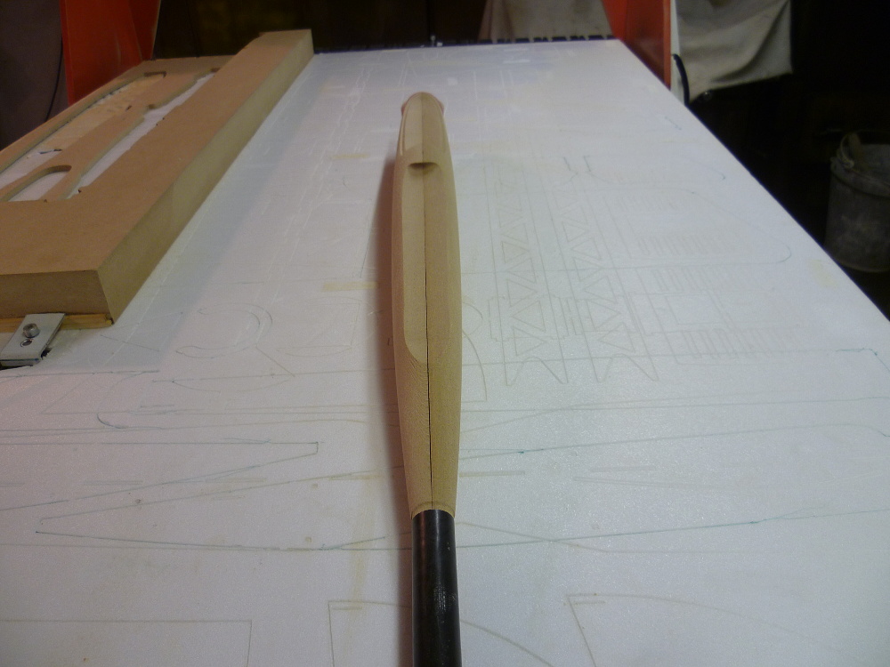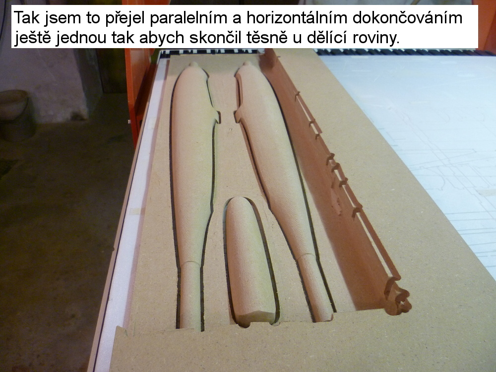 Další postup: Přejedu to ještě jednou, (možná raději zvolím horizontální dokončování), abych se dostal až těsně ke spodní hraně a odstranil tu rýhu po uvolněné fréze. Obě poloviny slepím a napustím řídkou epoxidovou pryskyřicí. Lehce přebrousím a nastříkám šprickitem. Lehce přebrousím a nastříkám plničem. Vyleštím........ Hotovo. :wink: