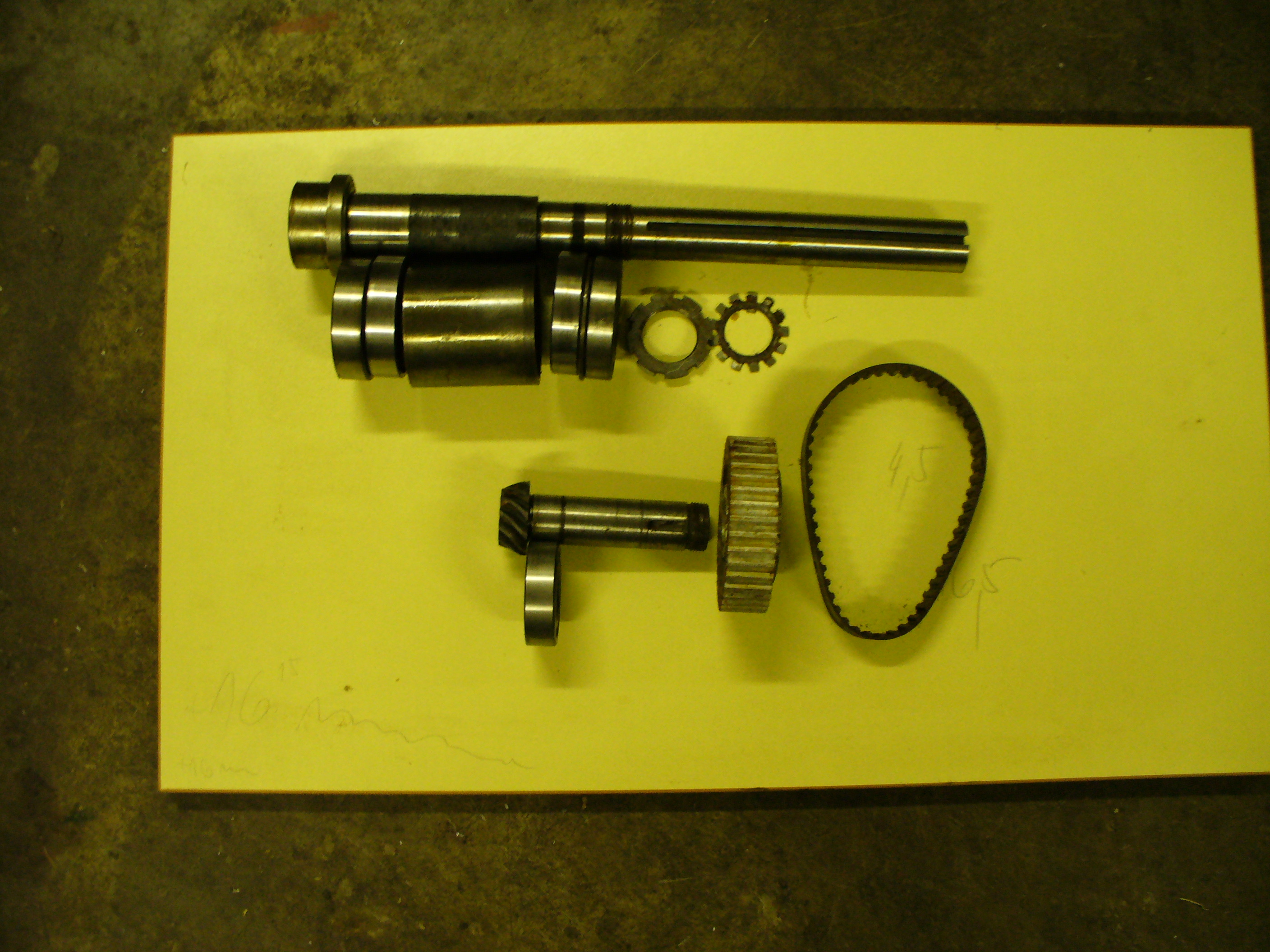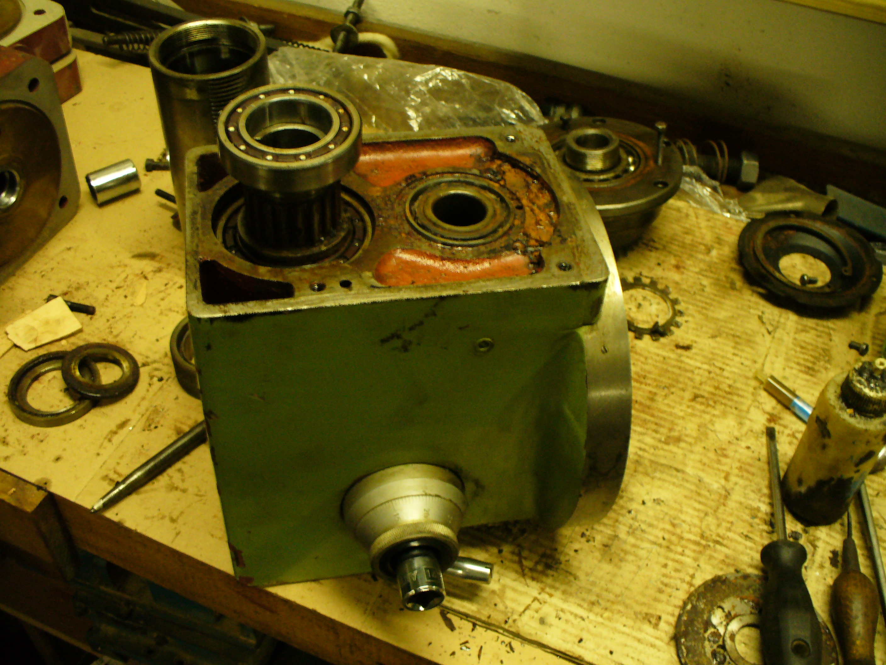 Ted jsem koupil rycloběžnou hlavu n FN40 .Je nepoužitá ,ale blbě skladovná.Tak že nutná výměná všech ložisek.Vřeteno iso30 ,max.ot. 10000 za min.Dole u kuželu dvě kuličková ložiska v textilové kleci ,přesnost P4.Nahoře dvě kosoúhlá ATB P4 do "x" .Další dvě kulčková ložiska v přesnosti P4 jsou na hřídelce kde je ozubená řemenice která pohání řemenem vřeteno.