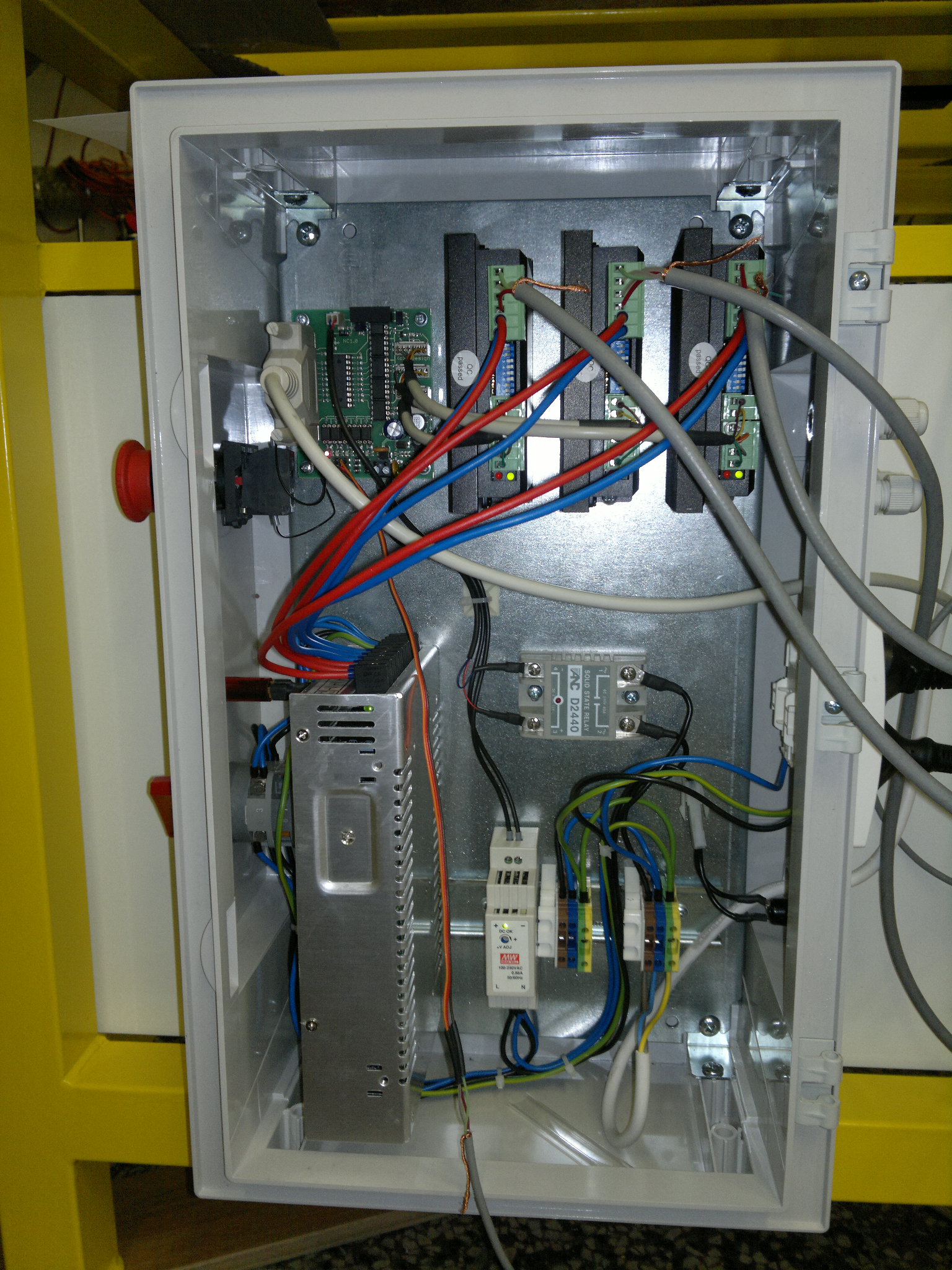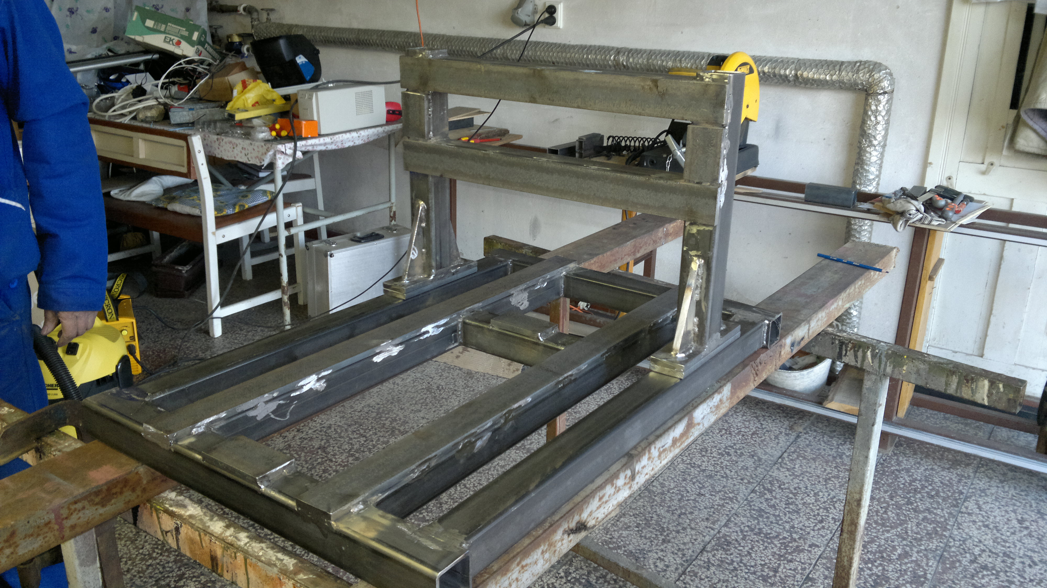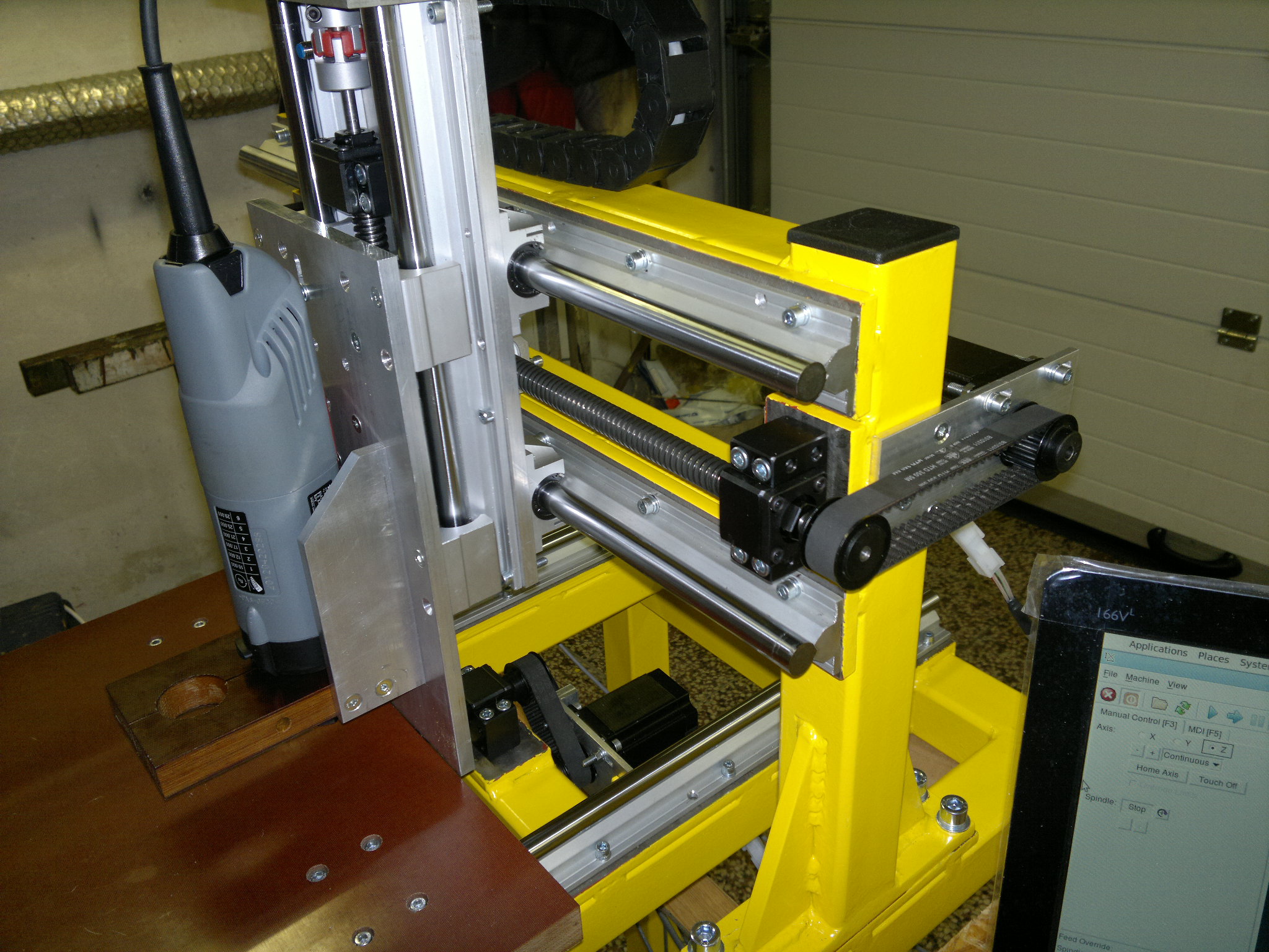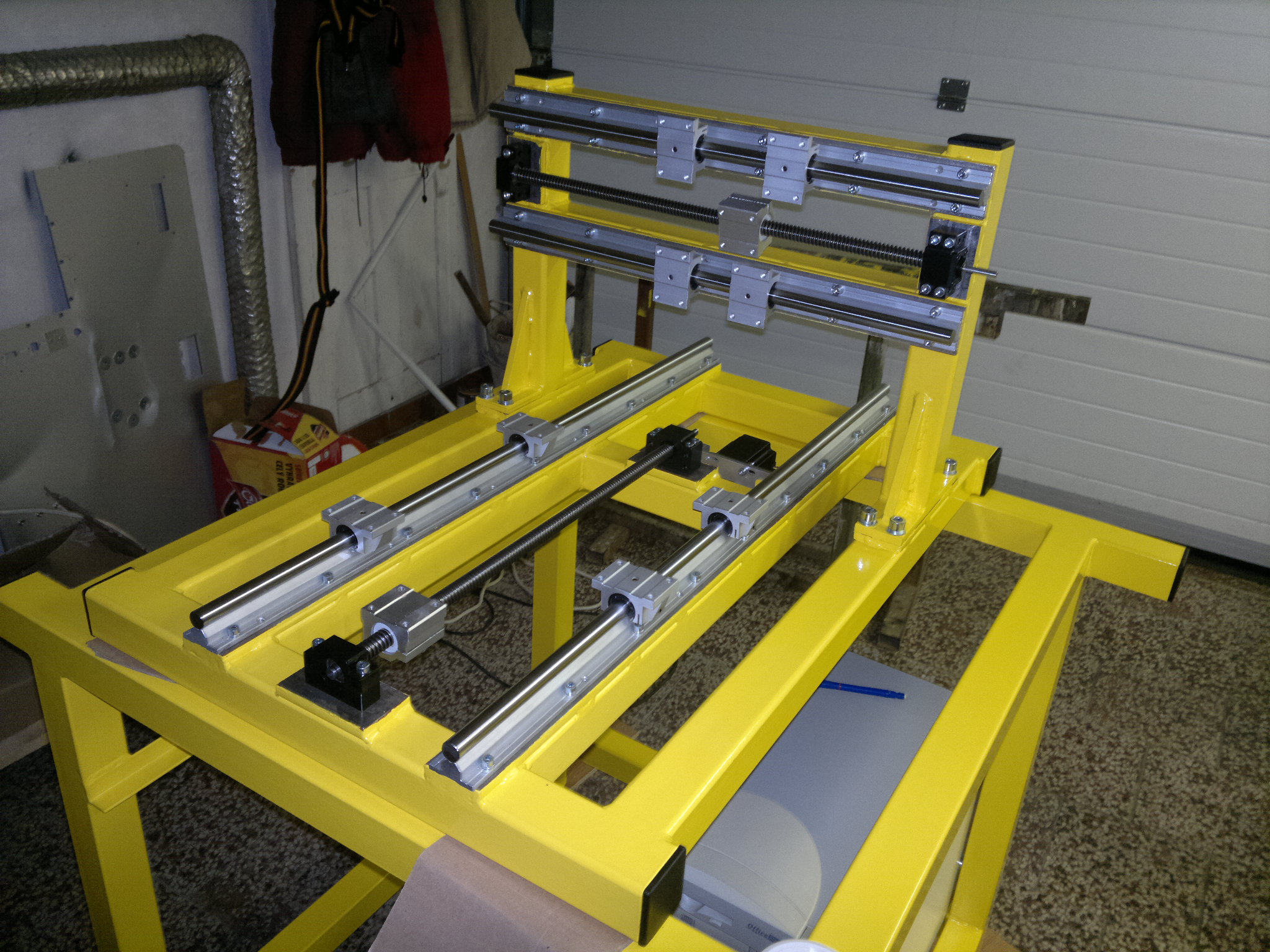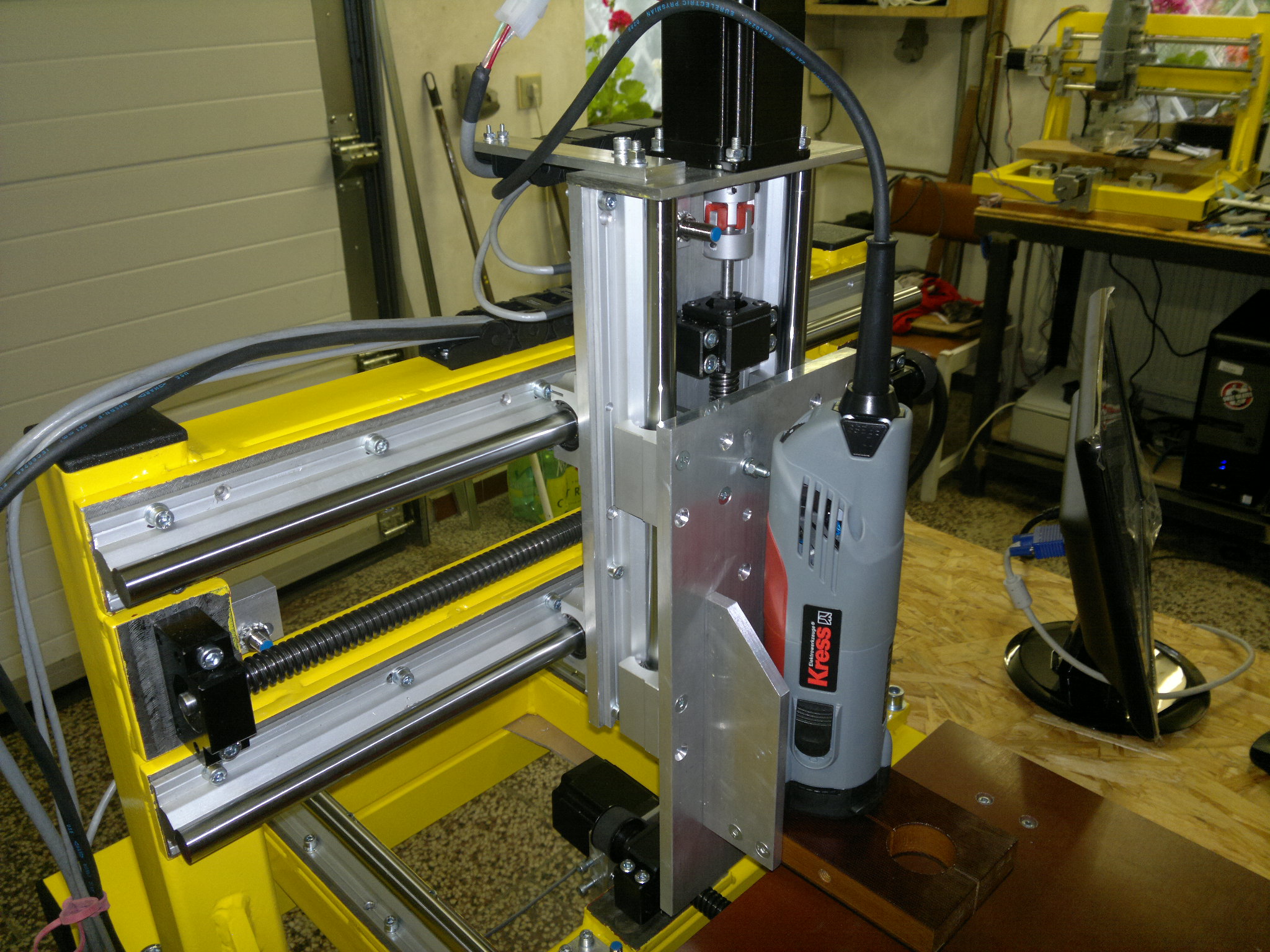 asi rok po zprovoznění našeho prvního stroje jsme rozjeli druhý. Zatím jen tak na sucho. Rám je smontován ze dvou svařených dílů z jeklů 50x50, tloušťka stěny 4mm. Pod podepřenými tyčemi je k jeklům nabodovaná pásovina tl. 10mm. Na fóru je plno odpůrců svařovaných konstrukcí, my jsme však spokojeni. Po nabodování pásovin došlo sice k prohnutí jeklů, bylo to však jen o pár desetin. Po svaření byl rám srovnán ofrézováním dosedacích ploch. Všechny osy jezdí po podepřených tyčích o průměru 16mm. Pohání je trapézový šroub 16mm/ 4mm na otáčku. Všechny osy jsou osazeny krokovými motory 1.9Nm. Rozjezdy 400x400x10mm. Každt osa má dva inbdukční snímače Home + Negative Limit a Limit. Vřeteno Kress. Na řídícím PC jede EMC. Na fotkách jen prozatimní kabeláž, mezi rám a stůl příjde ještě pracovní deska. Vodící tyče a šrouby budou ve finále zakrytovány měchy. Přikládám pár fotek.
