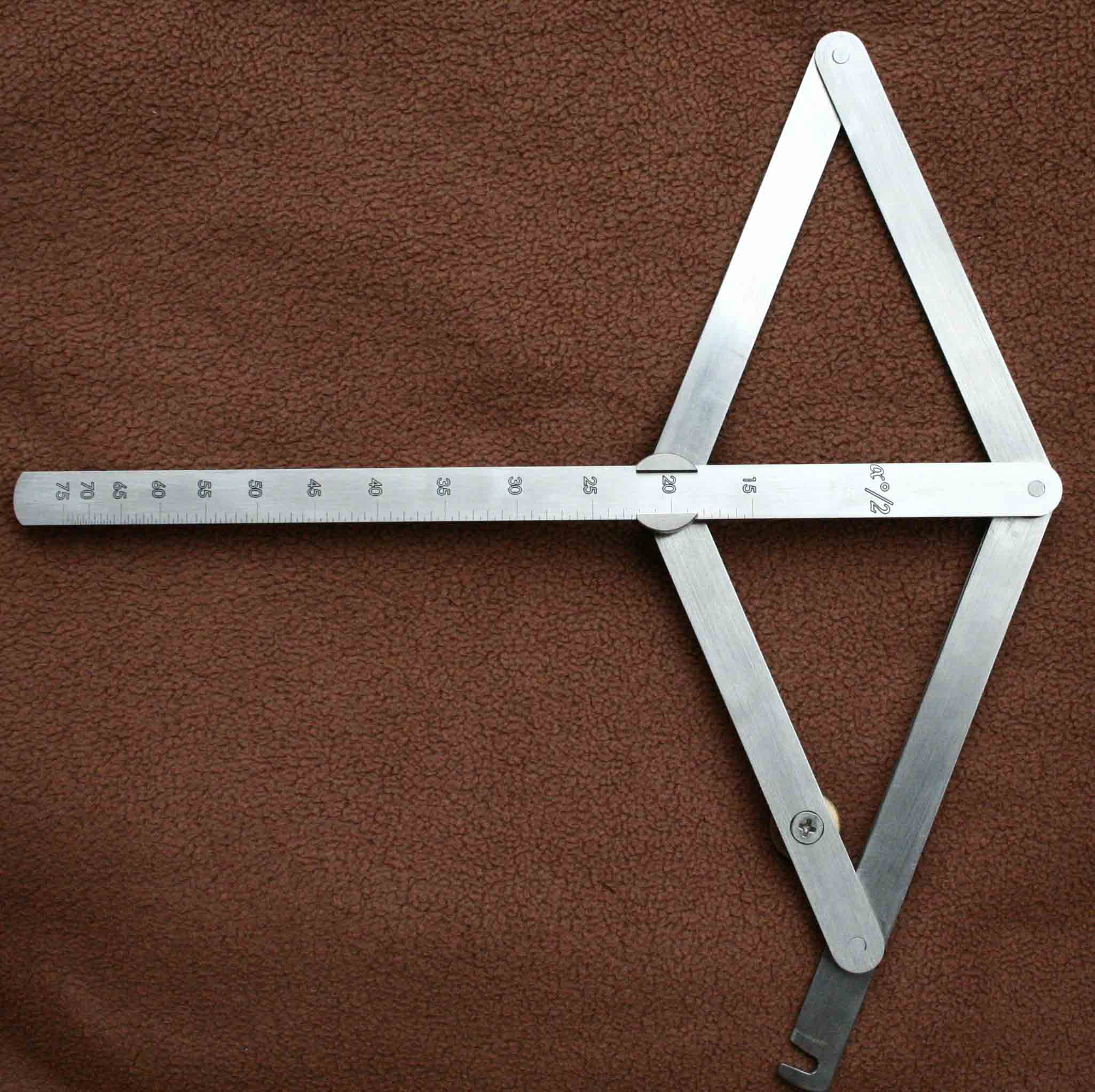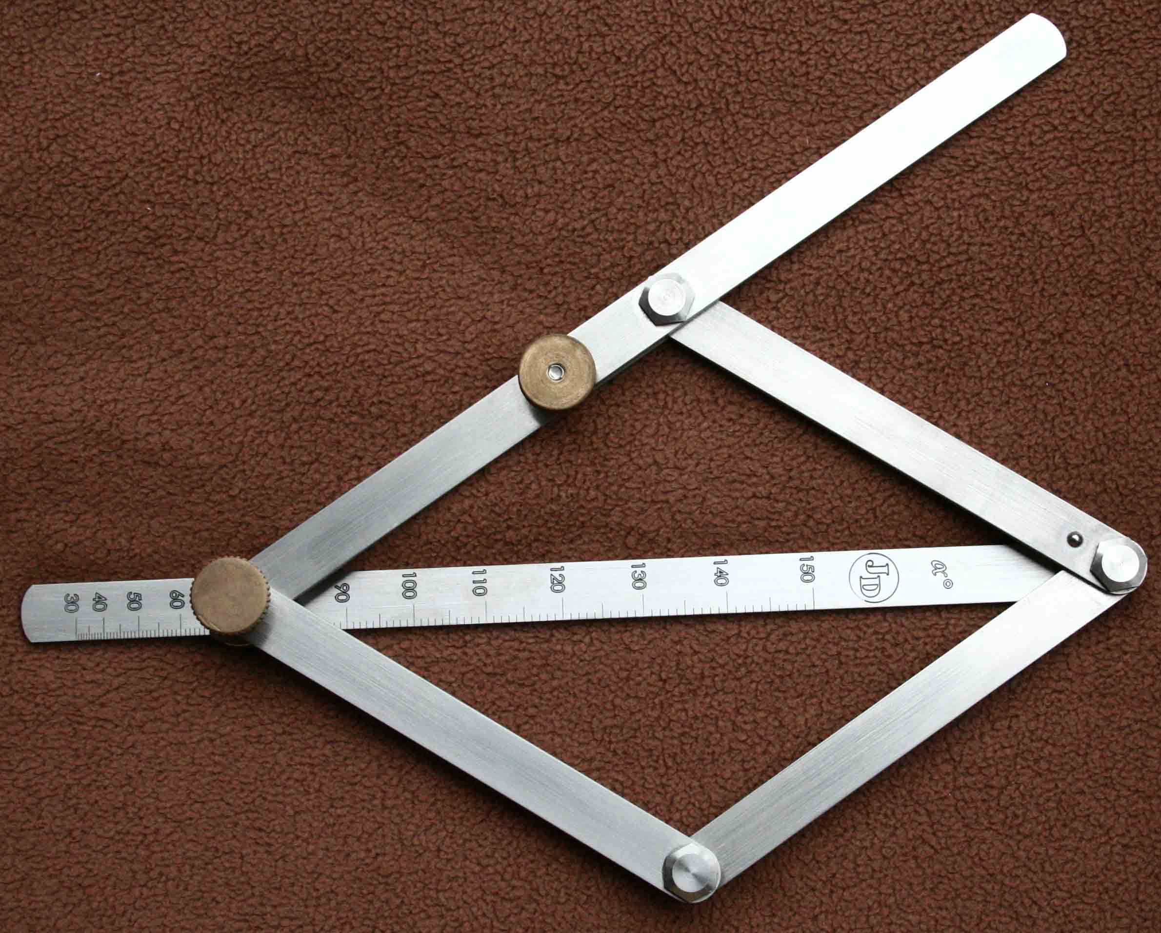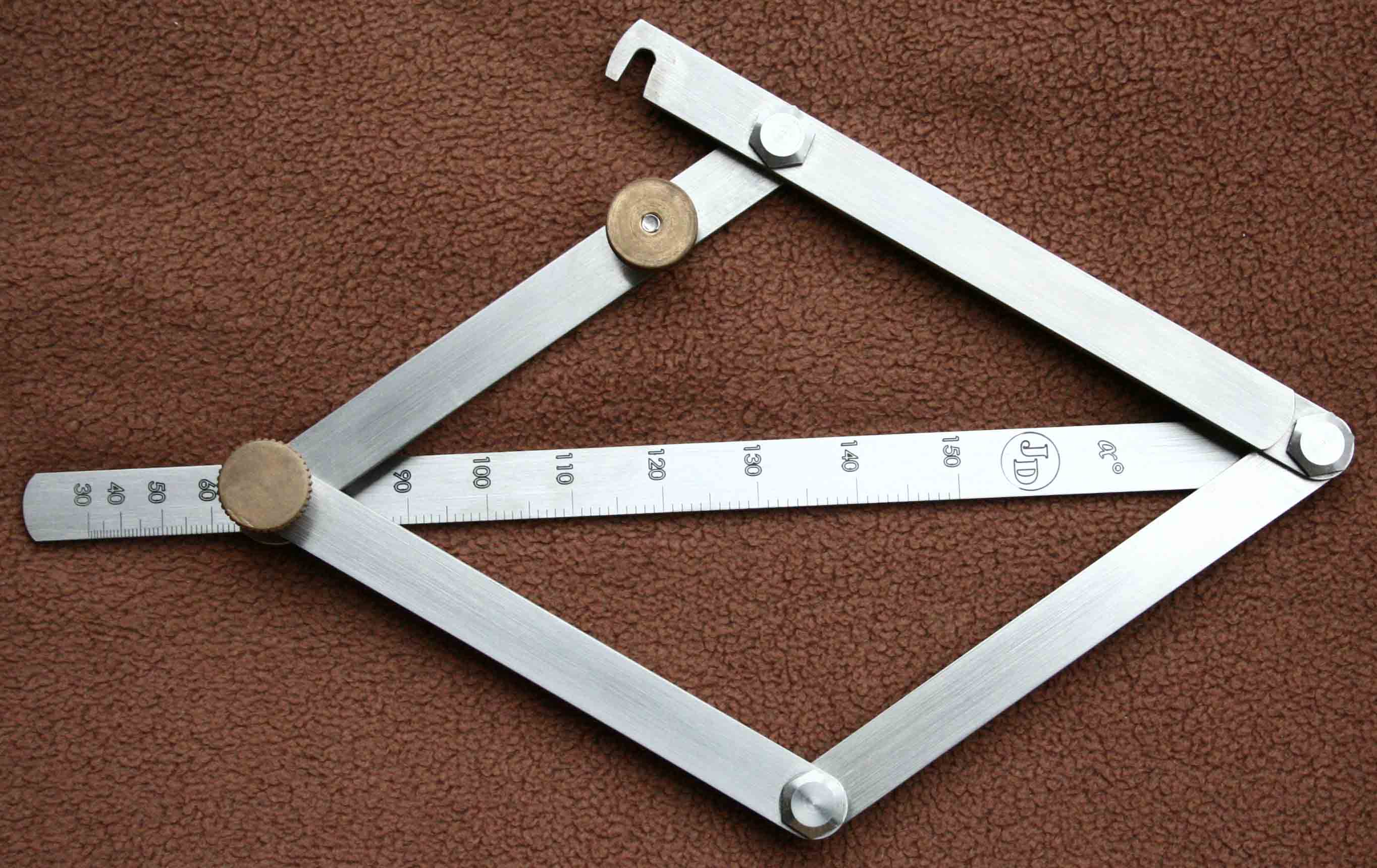 Kdysi dávno jsem se živil jako truhlář a podlahář. Mnohokrát se vyskytla potřeba změřit úhel svírající např. stěny místnosti (žádné nejsou v pravém úhlu :D ), při usazování dveří, prahů atd. Ve slabé chvilce a mírně posilněn pivečkem mě napadla metoda měření vnějších i vnitřních úhlů. Po brouzdání internetem jsem zjistil, že se nic takového nevyrábí. A tak jsem se pustil do práce. Použil jsem pouze nerez a mosaz. Na foto je výsledek. Dokonce se mi to podařilo přihlásit jako užitný vzor (ale toho papírování !!!)