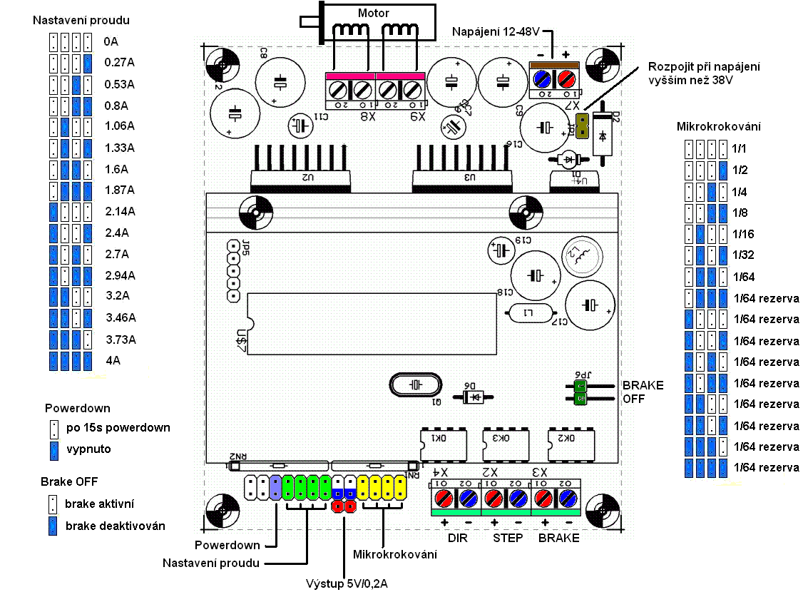 Napájení: filtrované stejnosměrné 12-38V (po rozpojení jumperu až 48V), volitelně až 55V proud dle konfigurace (zkratový proud driveru je 6-7A)