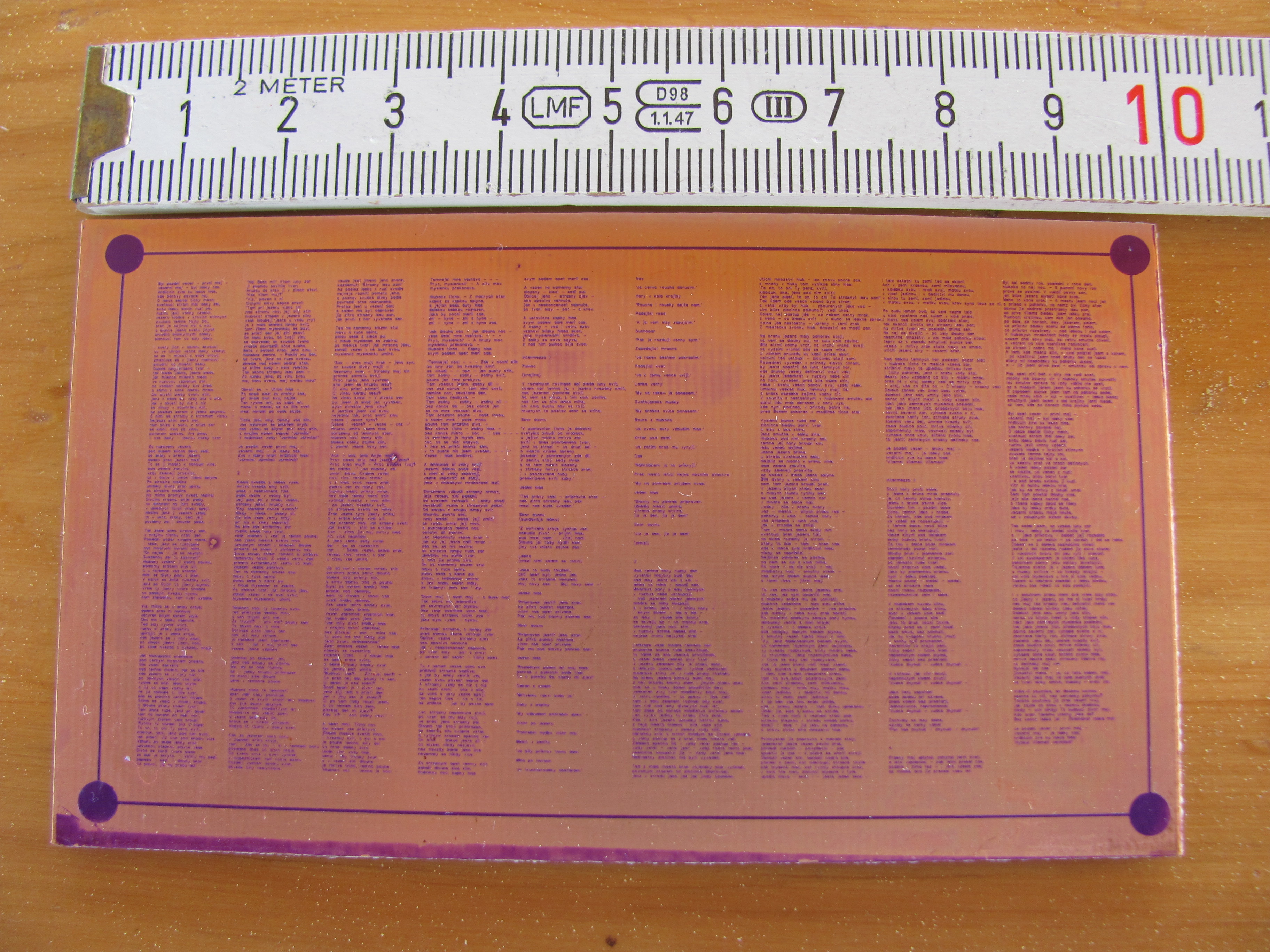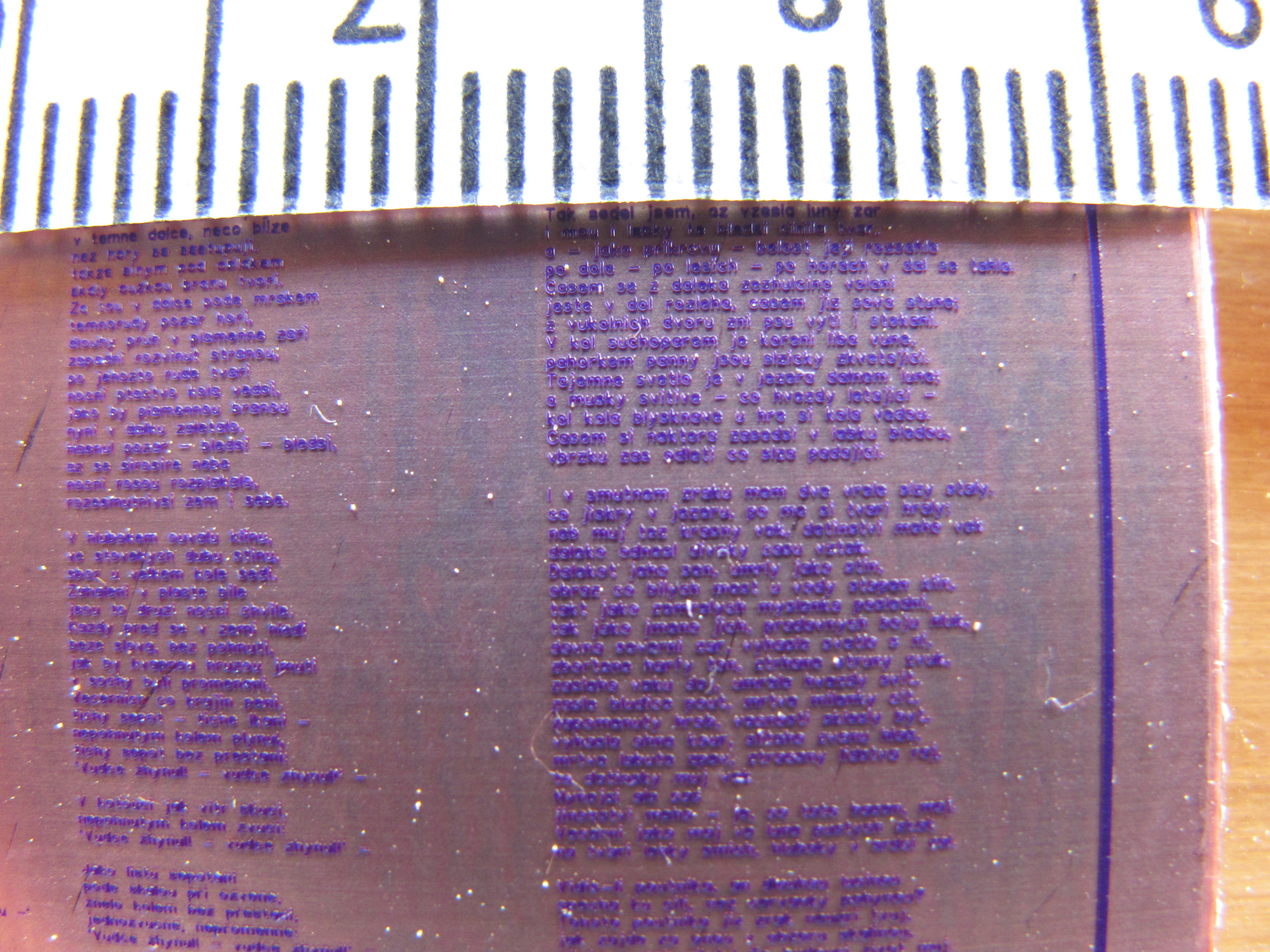 zkousel jsem leptat podobna pismenka - vicemene neuspesne. Resist je nanasen obycejnou zehlickou a sila medi je klasickych 35um. Sirka pismen je 50um, takze pokud nekdo vite kde sehnat desky se slabsi vrstvou, sem s tim.