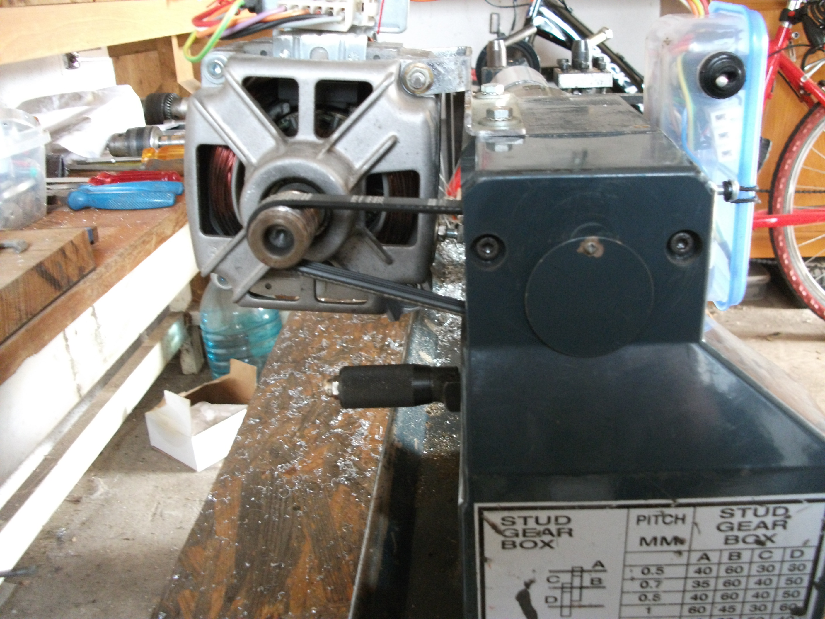 Robo-jak se sem dají dávat videa z PC?-každé se načítalo tak 5 min. Nedal jsem všechna...něco dám časem na You tube-a sem dám odkaz. Ke konstrukci-původně číňan byl velmi nestabilní...měl 4 gum. nožky snad 12 cm od sebe,to už jsem dávno předělal,že to stojí na dubových trámcích-příčně,opírá se to ve vzdál. aspoň 25 cm. Takže i teď s M. stranou nemám obavy se stabilizací(na fotu není vidět). A zcela určitě předělám hl. vypinač na regulátoru (aspoň ne páčkový,ale tlačítkový)-teď jak mám reg. uchycený, při manipulaci dotahování obrobku je snadné se dotknout,zapnout hl. vypinač! Naštěstí elektronika při velkém,náhlém odporu vypne-tak na 2 sekundy,než to vyzkouší znovu. Předělám. K automatickému posuvu-dural D 60mm-délka 25 cm asi. Třísku jsem bral asi 0,25 mm,tedy 0,5 mm na D. Bez problémů, ale chtělo by to vyšší točky vřetene,nižší rychlost posuvu-což původně na číňanovi bylo-pod motorem zezadu páčkový tahový přepinač L,H (low,high),který přetahoval plastová ozubená kola uvnitř pod vřeteníkem. Dávno už nefachčil,tak jsem se tam podíval...v hrudě vazelíny z Číny,ulámané plast. zuby.- Přepinač jsem už oddělal,neboť stejně ztratil význam,když mám pohon M. na vřetenník. Ale i ten posuv se dá zregulovat-výměnou koleček na místech výměn koleček pro řezání závitů. Ta kolečka mám,ale automat. posuv používám velmi málo-raději jedu citem-ručně-to není vidět,neboť v jedné ruce foťák na točení videa a druhou otáčet posuvem,musím zastavovat pro přehmat (který mám pro přesnost dost ztuha) není ideální. Chlapi,musím říct že s tímto motorem silným i v malých točkách je nádherná práce proti původní zdechlině...