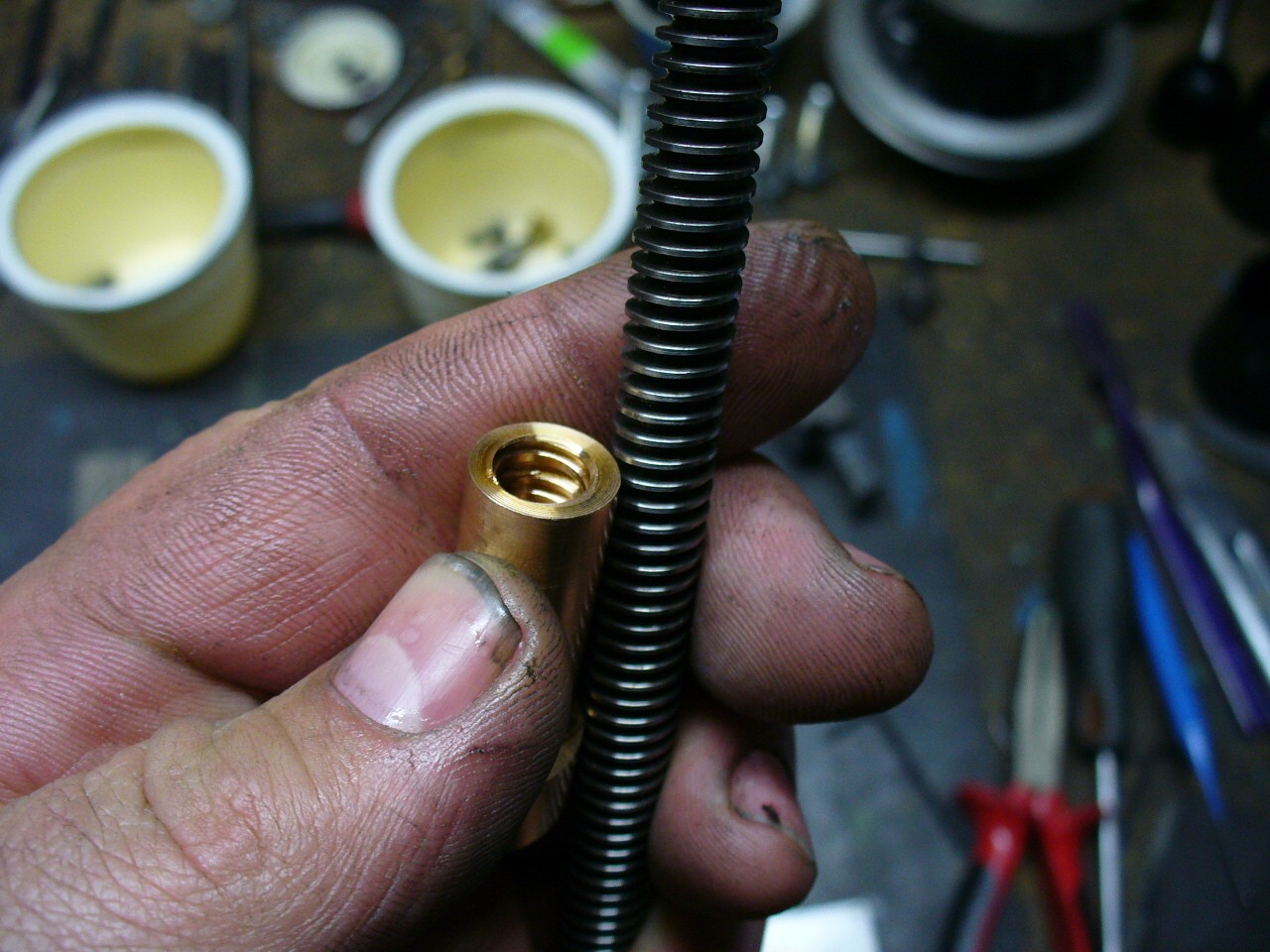 To jsem se neodvážil :) , hlavně proto, že jsem chtěl to vymezení vůle, které na origo matici prostě není. Originální matice je váleček o průměru 12,5mm, délce 40mm a v ní je závit Tr 9x2. Navíc ta nešikovná aretace polovinou průměru dvěma kolíky 3mm....tam by to asi dělalo paseku. A ano, lil jsem matici pro deckela, zatím to na něm chodí pěkně, i když vůle se už asi o stovku zvětšila...