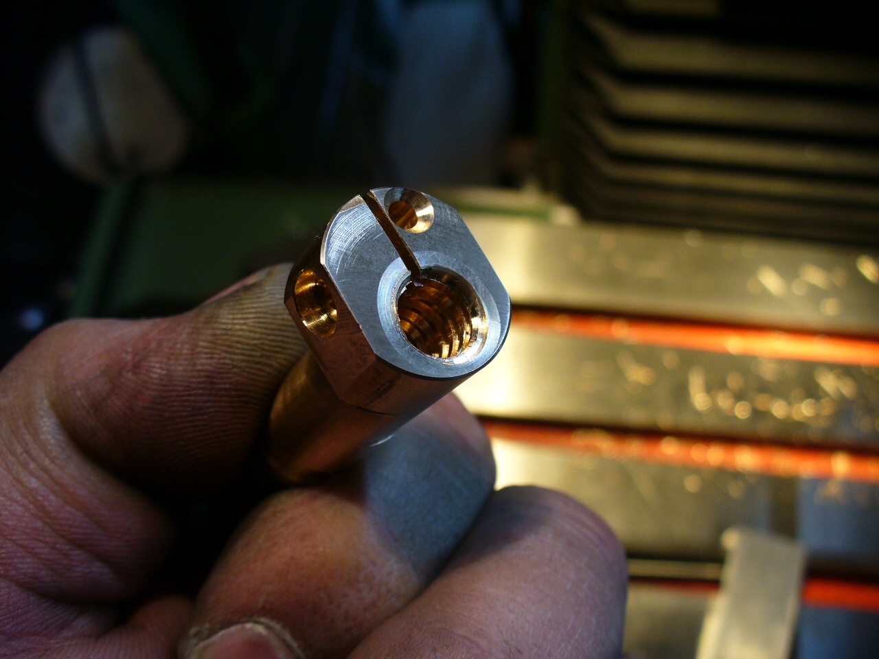 Soustružení nové bronzové matice pro příčný posuv na Schaublina 102, závit je Tr 9x2 v délce 40mm !! :wink: Původně jsem chtěl koupit od číňana závitník a dodělat nový šroub, ale ten origo nebyl vůbec špatný, tak jsem ho jen v jednom kraji zreguloval a vyrobil si svou, oproti originální neštelovací, vysloveně pitomě aretované matici novou se "stavitelnou" vůlí, obětoval jsem 8mm příčného posuvu, šlo by to ještě celé zapustit, ale u tohoto typu je to úplně jedno :) .