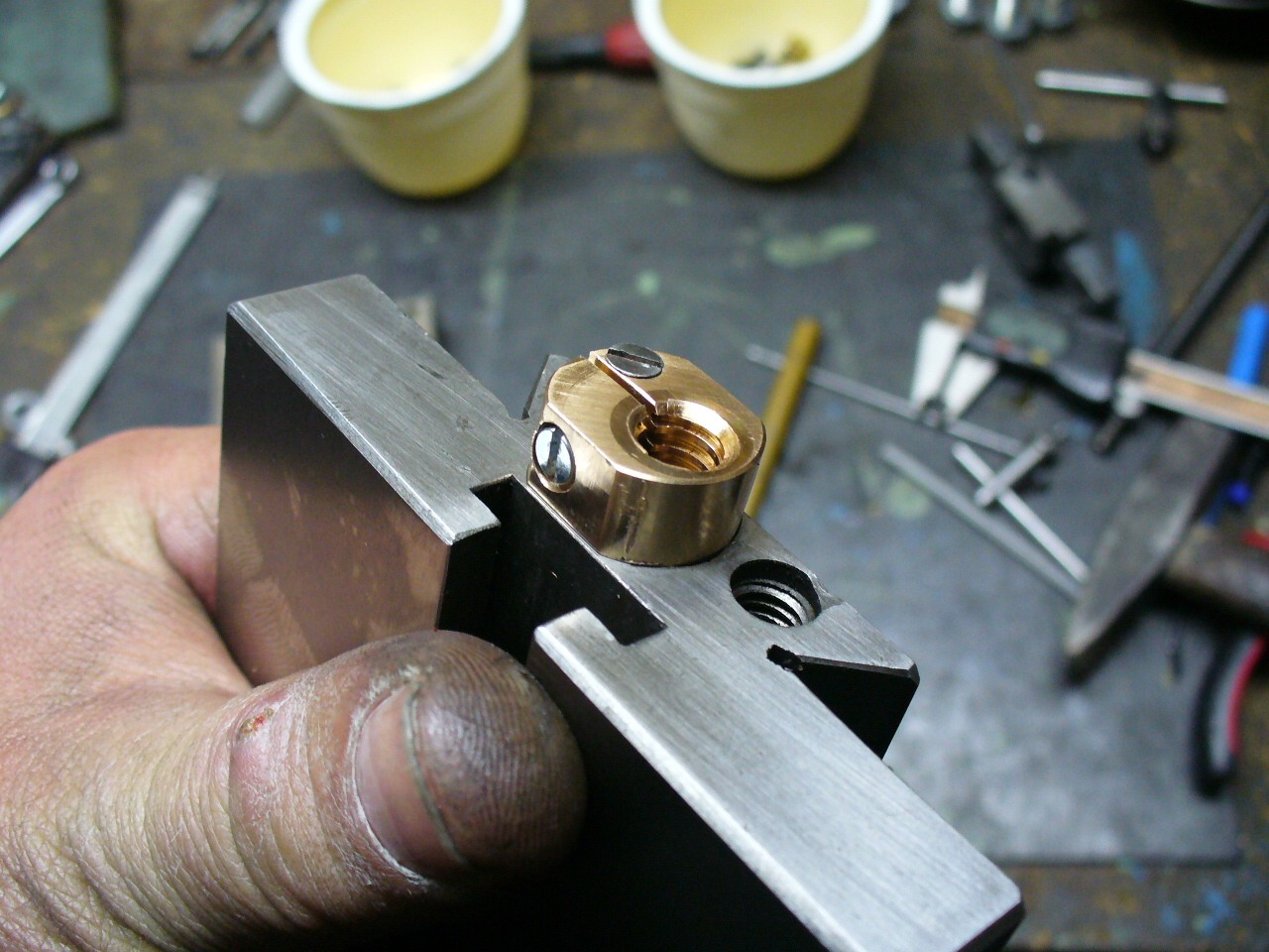 ps. zjistil jsem, že kleštiny vůbec nemusí být dělené - otvory jsem udělal natěsno, takže závitníky do nich jdou zasunout velmi ztuha (centrování je tak zajištěno a protočení zabraňuje upnutí za 4hr )