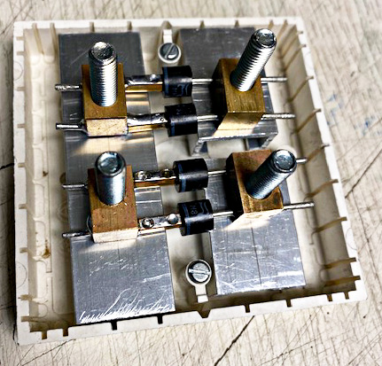 Abych si nějak ujasnil, jakže to vlastně funguje ta nová spása světa v podobě fotovoltaiky, tak jsem vzal pár korun, cca 40 litrů a koupil dva 450Wp panely, docela chytrý měnič, dvě trakční baterky a zbytek už zvládnu sám. Informací spousta hlavně těch pozitivních :D . Můj cíl je vyzkoušet, jestli sluníčko dokáže uživit ledničku. Protože měnič přijede až tento týden, začal jsem panelama. Jižní kompletně otevřená strana, tedy ideální stav. Protože měnič má optimální pracovní napětí FV 30-70V, zvolil jsem panely amerisolar s Umax 51V a Upacovní 42V. Paralelní propojení jsem udělal přes spliter vlasní výroby. Shottky diody 20A/220V za celých 34korun, krabička z OBI a pár gramů filamnetu. Podobný výrobek stojí od 1500 korun výš a překvapivě je v chladiči namáčknutá dvojice alternátorových diod. Při 10A jsou moje diody teplé pod 40 stupňů a úbytek je 0,71 a na druhé větvi 0,72V.