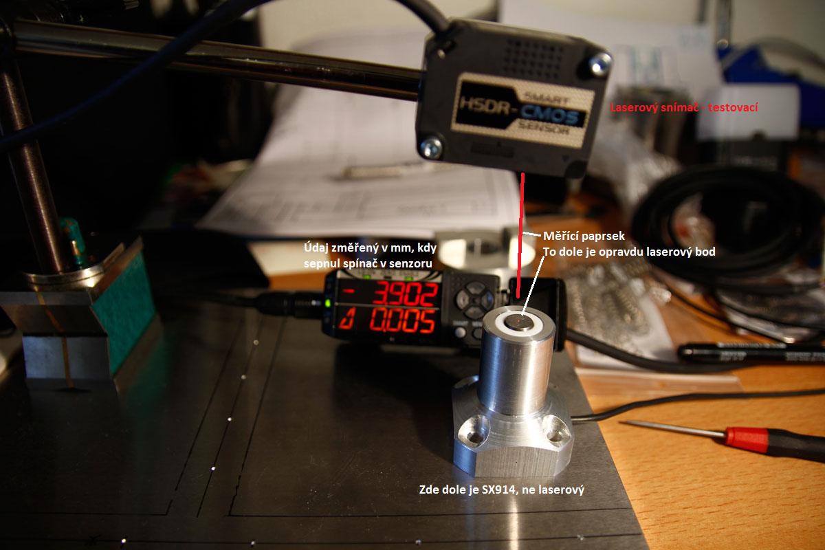 Laser měří povrch válečku a šroubováčkem jej zatlačím a pomalu zdvihnu. Vždy když senzor vypne, laser zaznamená vzdálenost.