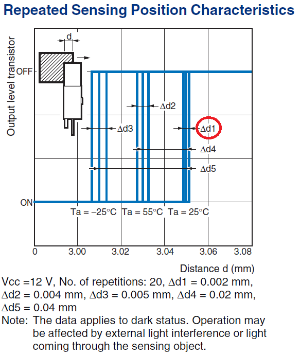 Snímací senzor je EE-SX914-R a ta vyčtená hodnota 0,025mm je rozlišení dvou bodů když by se snímalo okénko, nebo pásek (jinak zaregistruje to nejmenší otvor 0,025mm široký). To nemá s přesností spínání nic společného.