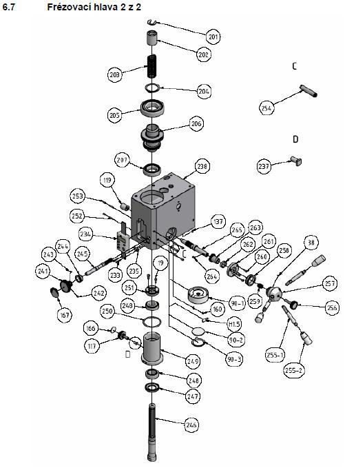 Při montáži jsem nasadil na (246) plastovou podložku, usadí se na dno (206) a přitiskne se ke dnu pružinou (203). Velikost je podle vnějšího průměru pružiny, vnitřní otvor jde mírně ztuha nasadit na drážkovaný hřídel. Třením o dno/hřídel omezí to klepání. Je potřeba vzít ne moc tuhý plast a strefit vnitřní díru, musí to trochu váznout na hřídeli (246) aby to omezilo klepání, ale zase ne moc, pak by se při vrtání vřeteno samo nevracelo.