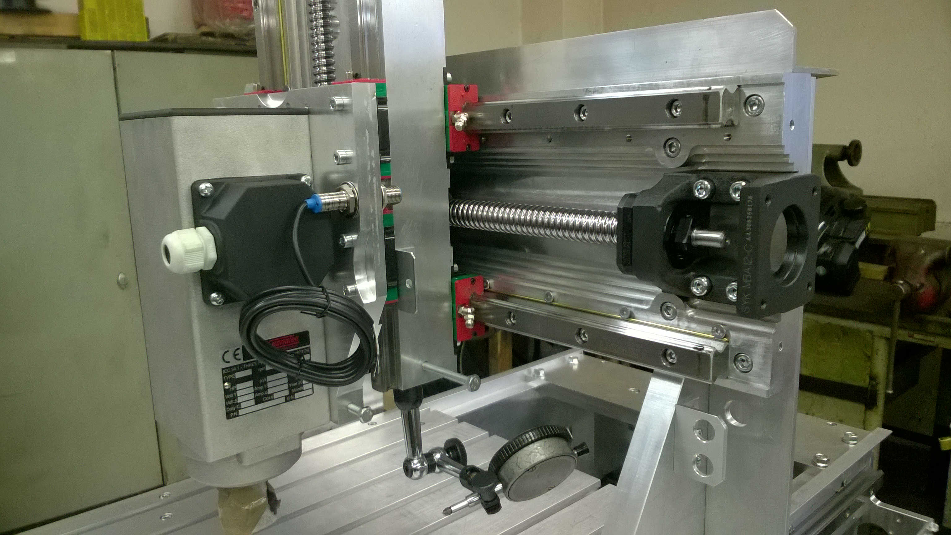 Už se to začíná podobat frézce. Osa Z dostala vřeteno Teknomotor 1,6kW včetně kuličkového šroubu. Osa X je už taky osazená součástmi pohonu. Prekvapilo mě jak málo síly stačí na otáčení šroubem. Motory tam přijdou až úplně nakonec. Byla v plánu už i osa Y, ale časově to nevyšlo. Čekám na dodělaní hřídelky pro řemenici k motoru. Zatím se na pohonu u Y objevila akorát kladka pro zvýšení opásání. Je na ní radost pohledět když je černěná
