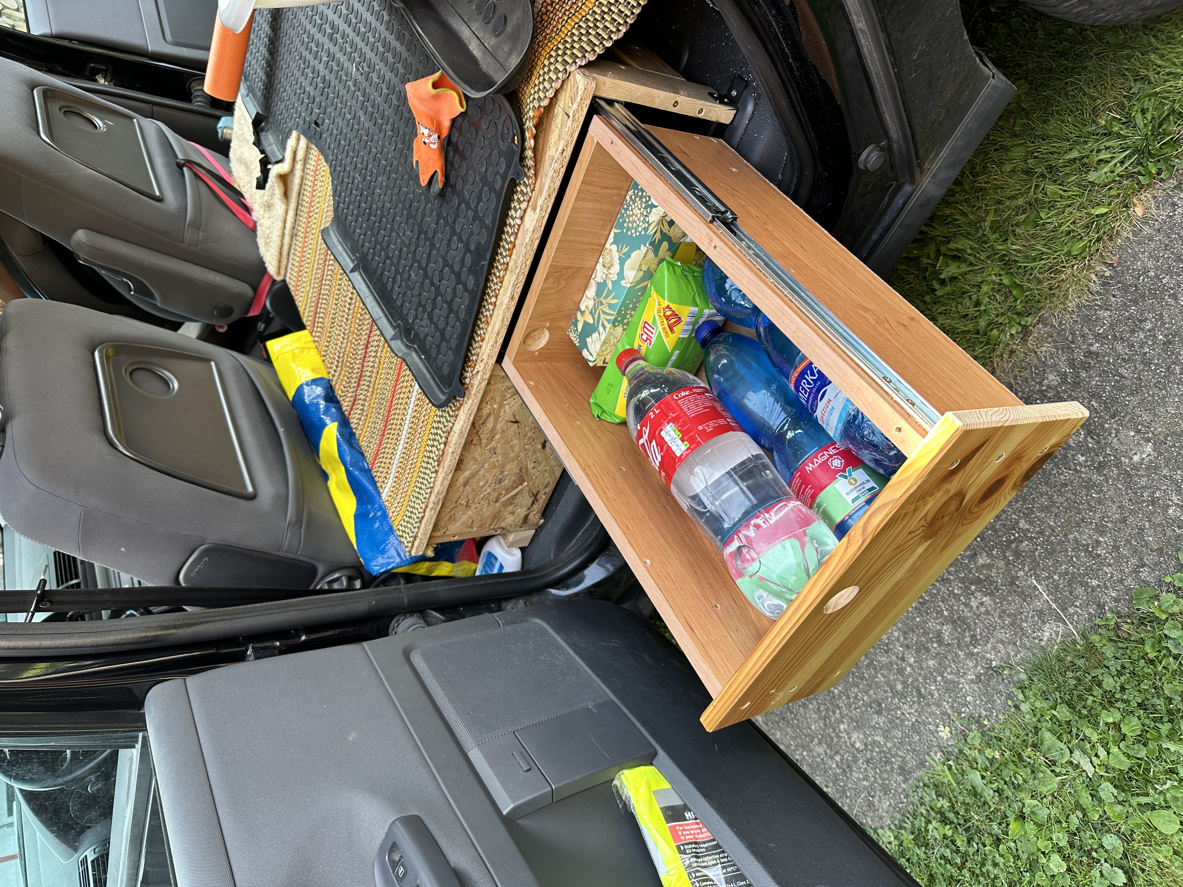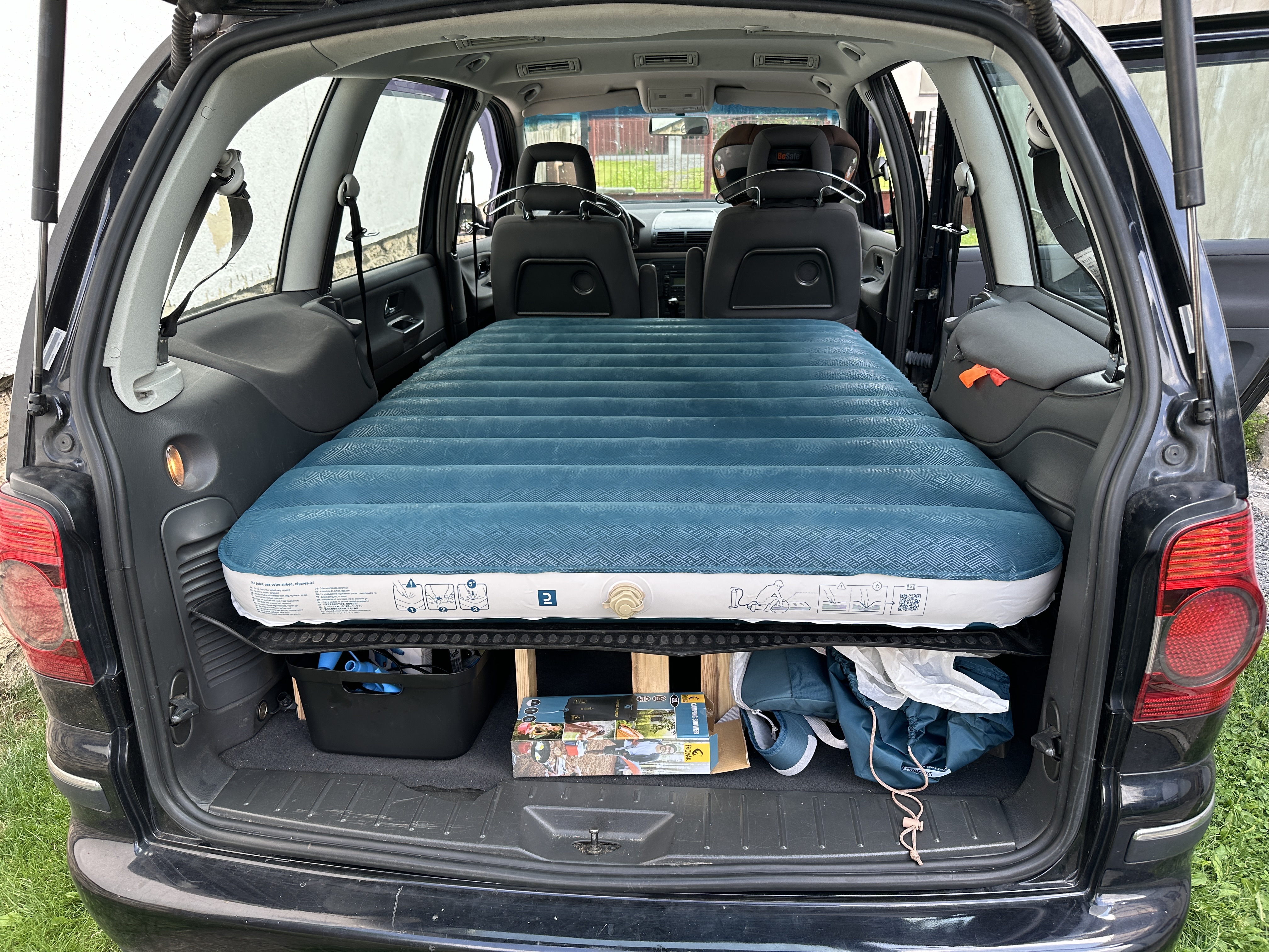 Jednoduchá “vestavba” do sharana na vylety a prespavanie v aute. Material osb 18mm, drevo, zadný suplík vysuv 700mm a bocny 500. Je to urobene ako jednospanie s rozšírením na dvojspanie. Matrac sa osvedcil z Dekathlonu 120x190x17 , na jednospanie bude 70-ka.