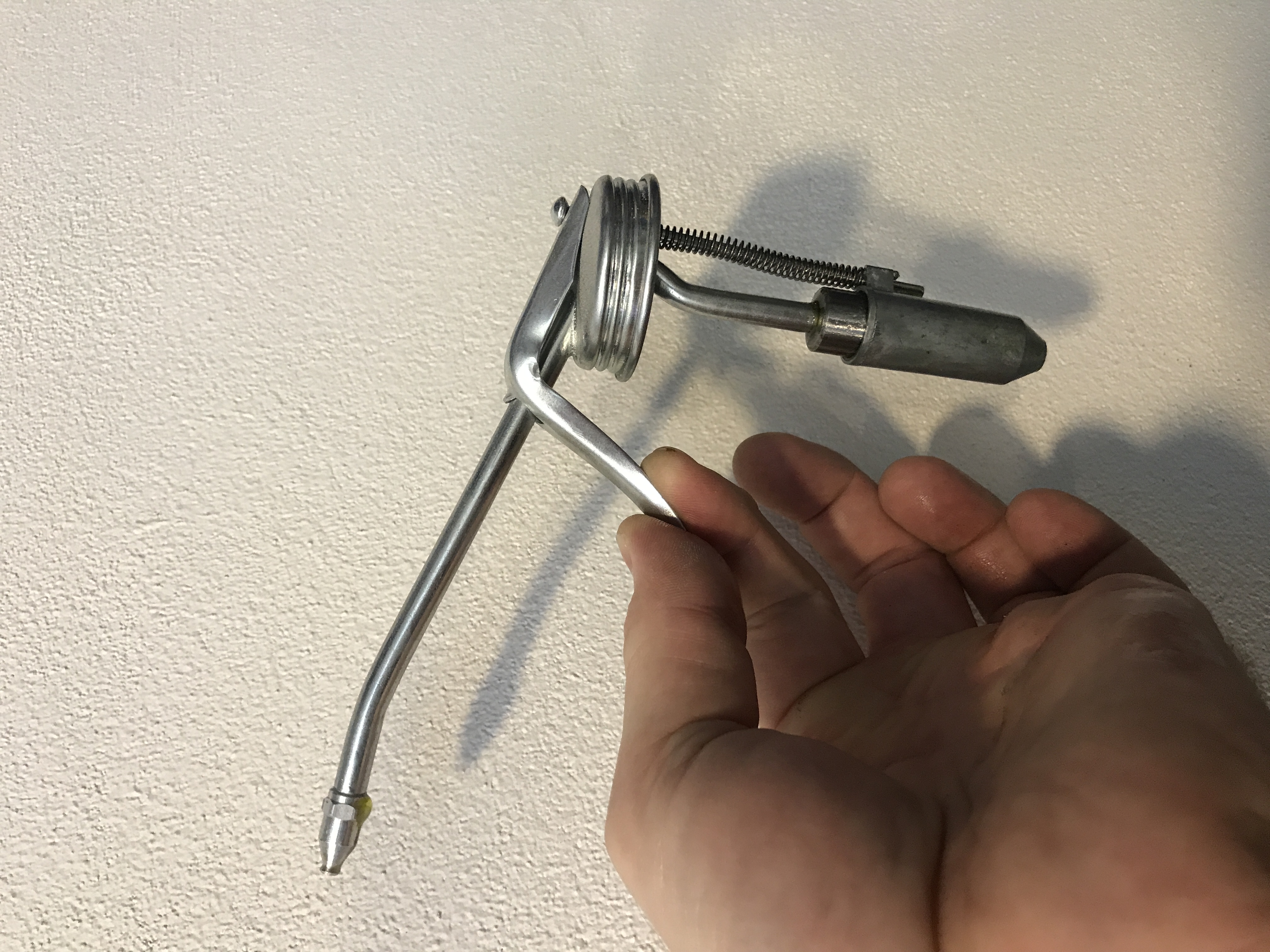 Ta dvacítka (i desítka) se dá zase prstama stisknout ze strany a vytlačit jednu kapku. Jen když je potřeba někam šprknout víc, tak se teprv zatlačí na píst.