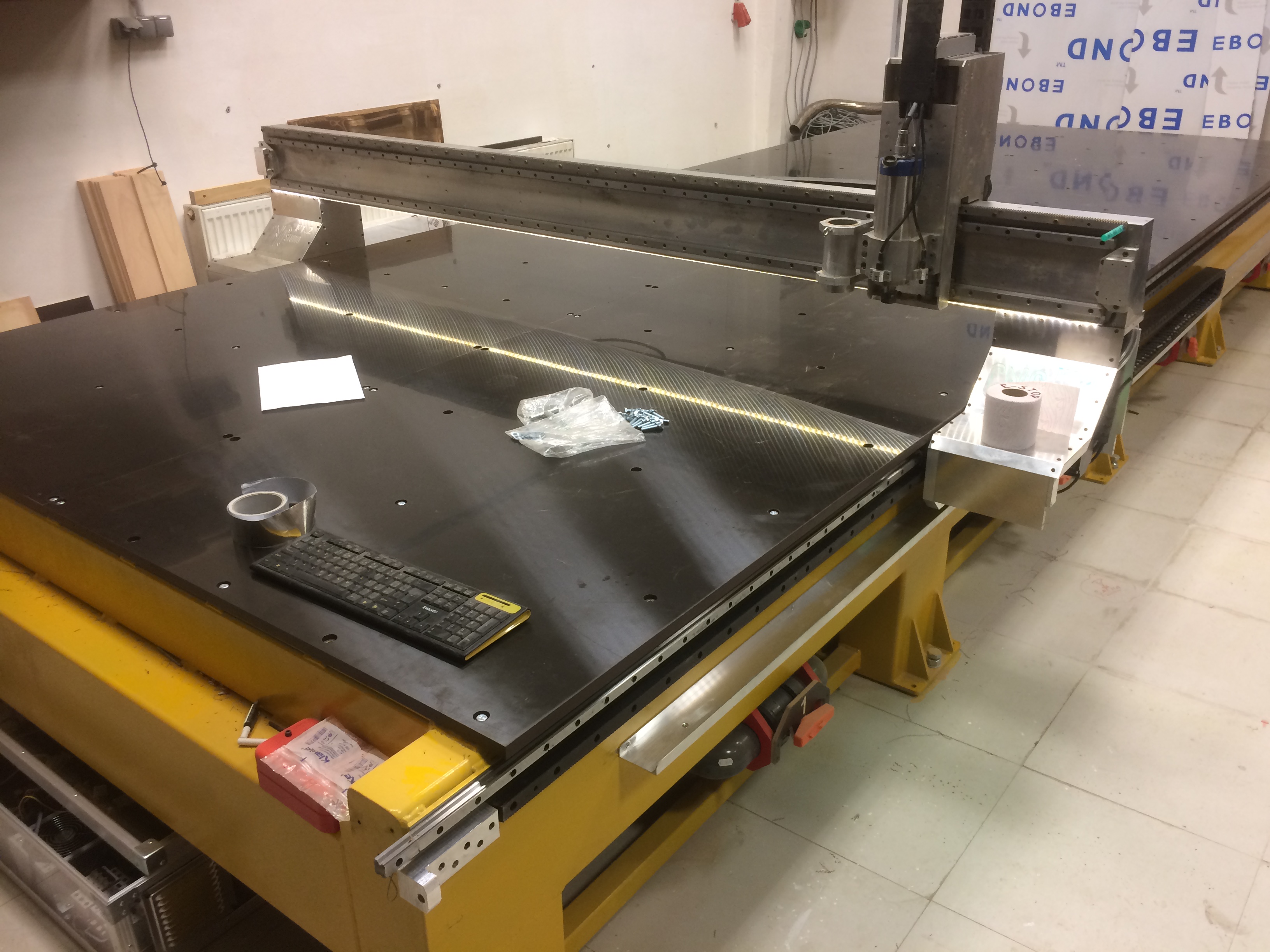 Deska je z 20mm pertinaxu. (cena celkem cca 40.000,-). Na mě se nedívejte. Sami si to zvolili. Bejt to na mě aspoň připlatim 40k za hliník. Teplotní roztažnost pertinaxu je nespecifická, ale vyhrabali údajně koeficient 40. Železo má tuším 10-12? No, uvidíme co to bude vyvádět...