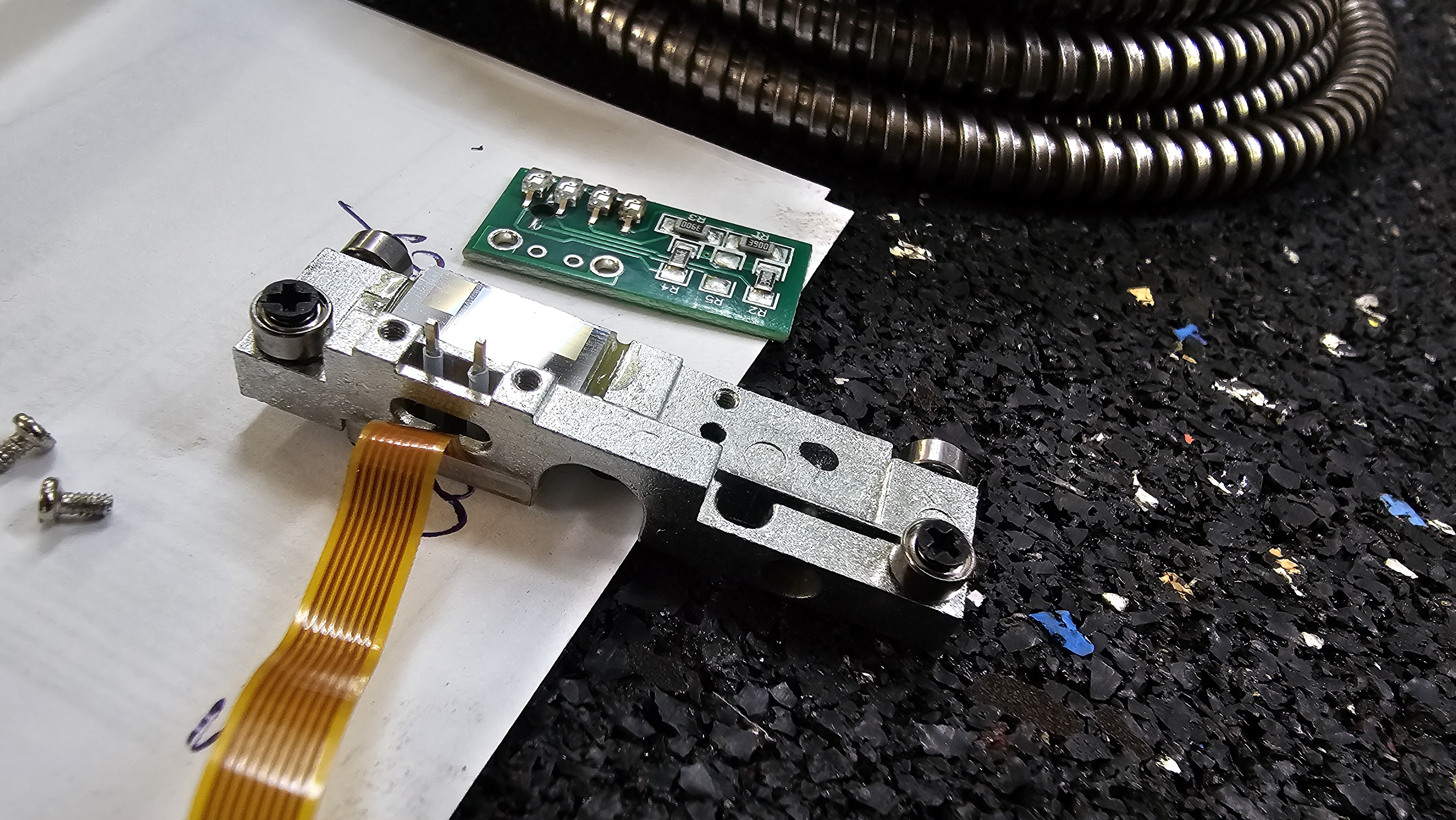 Na foto rozdělaný snímač. Destička patří nasadit na ty dva piny do těch krásně čistých prokovů, a po stranách přišroubovat.