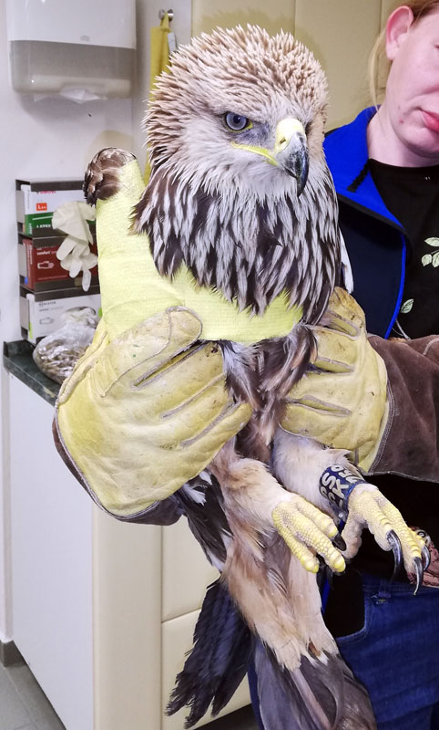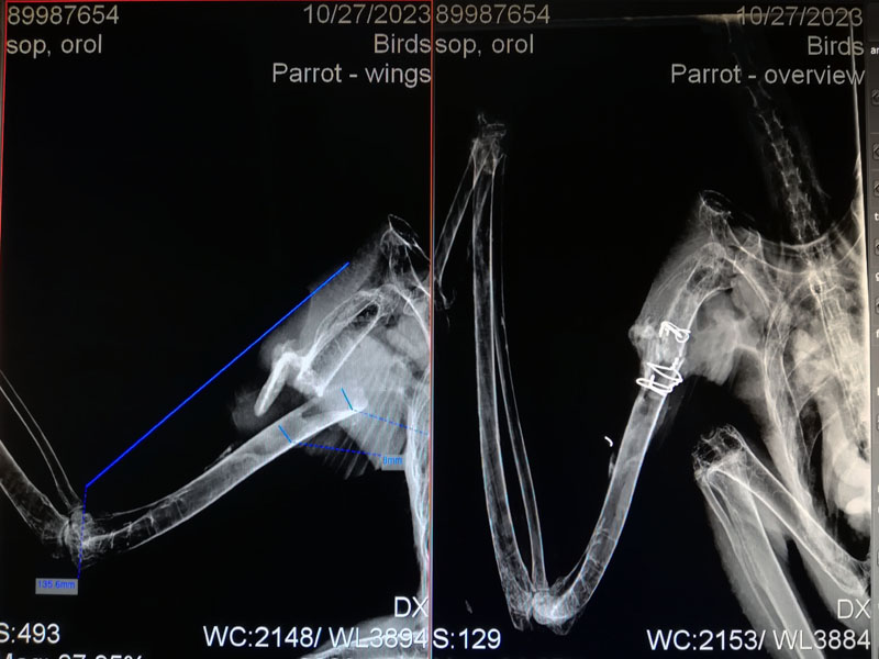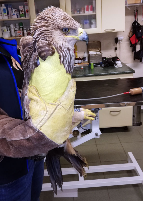 Pacientom bol mladý Orol kráľovský. Otrávil sa jedom na potkany, keď požral priotrávené hlodavce. Ako bol oslabený, zrazilo ho auto a utrpel zlomeninu ramennej kosti. Keď sa trochu pozviechal z otravy, bolo treba rýchlo zoperovať krídlo.