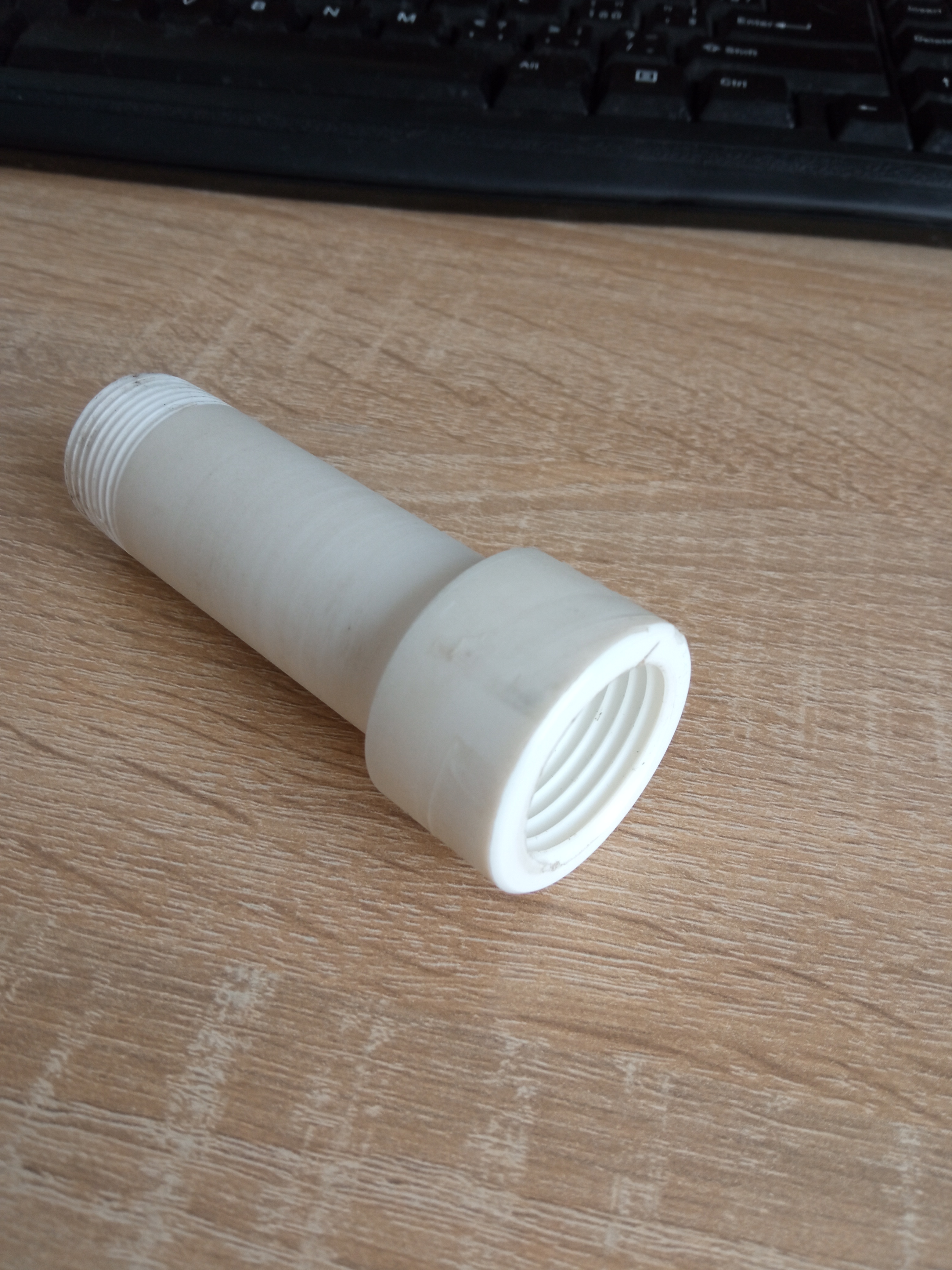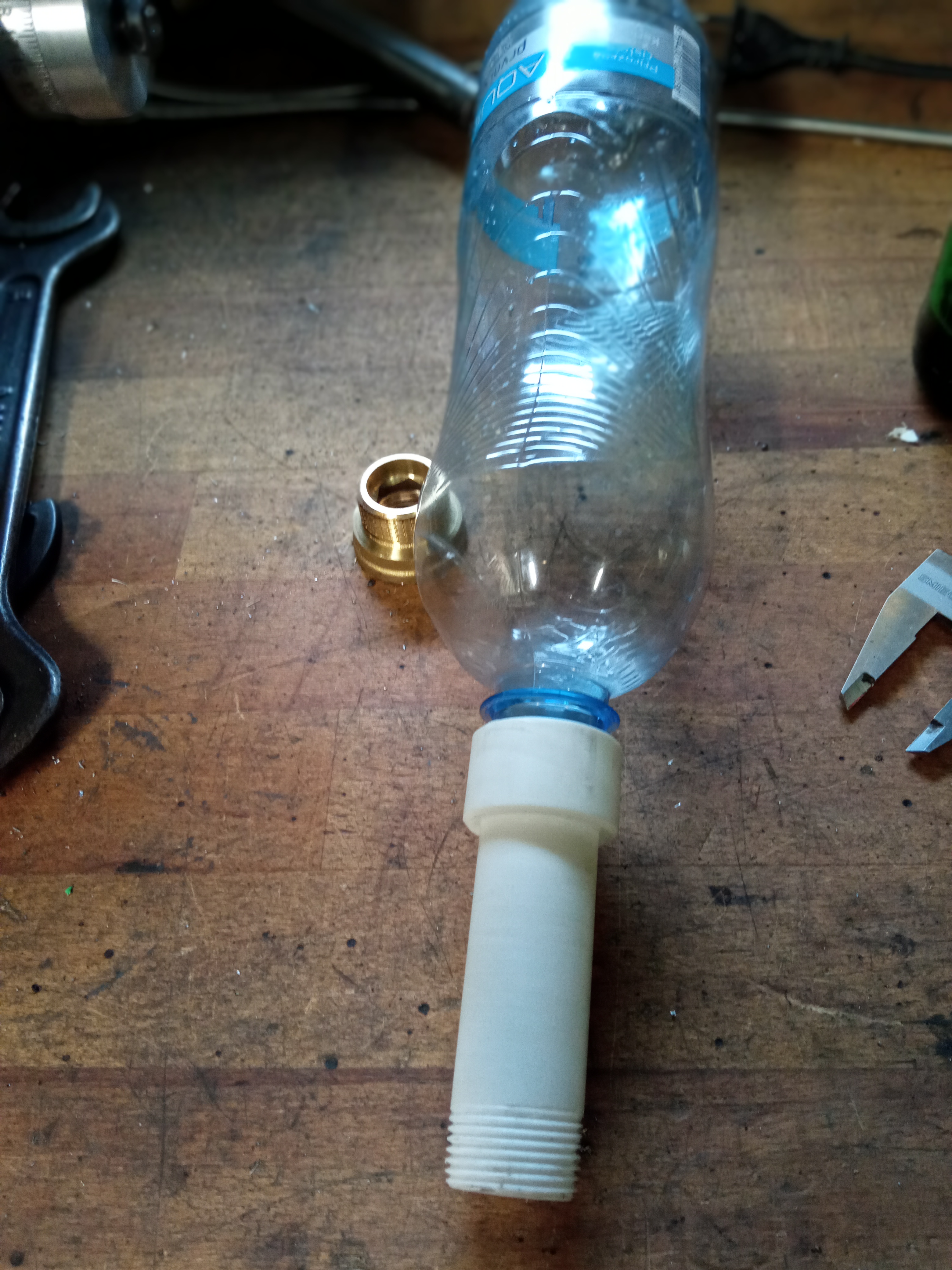 Vážně se nechci zabývat výrobou, ale soused mne doslova ukecal na výrobu redukce pro lahve 0,75L. Barevné kovy jsou drahé a tak nastoupil plast, konkrétně ZEDEX. Závit na Aqilu mi vyšel M25x2,5 a na druhé straně je klasická 3/4, všechno řezané nožem.