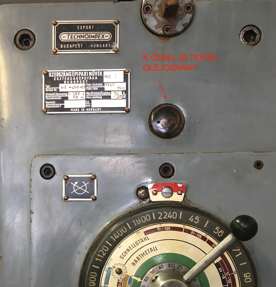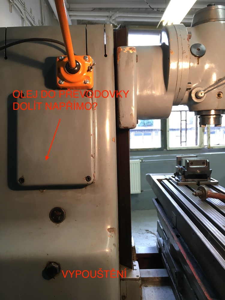Díky moc za info! Teď už je mi snad vše jasné – zkusím tedy výměnu oleje provést dle tvého popisu.Petr68 píše: ↑10. 1. 2019, 3:25 Na první fotce vše správně. Sundáš dekl, naleješ olej zhruba do 3/4 spodního olejoznaku a vypouštění je tedy zátka pod olejoznakem. Ten druhý olejoznak na který se ptáš je kontrola mazání. Je do něj přivedena trubička od čerpadla a za chodu při splnění všech podmínek, jako olej ve skříni, funkční čerpadlo a trubičky průchozí, se do tohoto olejoznaku rozstřikuje olej. Posuvová převodovka. Napouštění správně, vypouštění nee. Olej se vypouští ze spodu převodovky. Jsou tam 4 průtokáče a olej se vypustí povolením toho největšího tj. druhý z leva při pohledu od páky. Svislá hlava. Vše špatně. Ta zátka je jen kontrolní pro soukolí náhonu. Olej se leje do zásobníčku na vrchu svislé hlavy. Je tam symbol olejničky a šroub. Z tohoto zásobníčku se olej nasává přes dva knoty a odkapává na soukolí a do vřetena. Častěji kontrolovat a doplňovatAž se prostor okolo vřetena řádně naplní a začne vytékat spodem okolo ložiska, tak je to parádní olejová sprcha