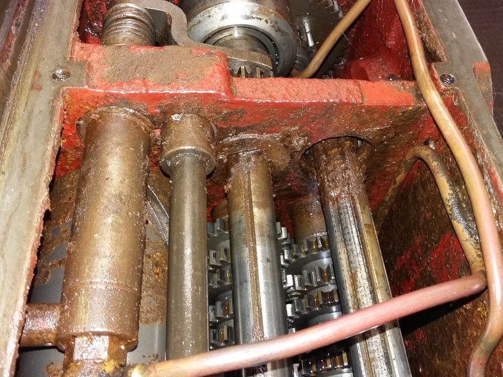 Na vršku převodovky je víko s těsněním a emulze by se stejně do tohoto místa neměla vůbec dostat. Pokud by tam přeci jen zatekla, tak by musela kapat z konzole na nohu a to by bylo vidět. Myslím si, že se tam voda nějakým způsobem prostě sráží. Nejsem sám, kdo měl v téhle převodovce vodu. Na horním víku po sundání byly kapky vody a orezlé fleky a v převodovce tak 1/4 litru čisté vody. Dokonce jsem si myslel, že to nějaký blb udělal schválně. Díky tomu má převodovka tendenci totálně vyhnít. Sám jsem nějaké hřídelky dělal nové, protože třeba půlka chyběla. Ideální by bylo převodovku vytáhnout, kompletně vyčistit, přetěsnit a pokud možno udržovat frézku alespoň trochu ve stabilní teplotě.