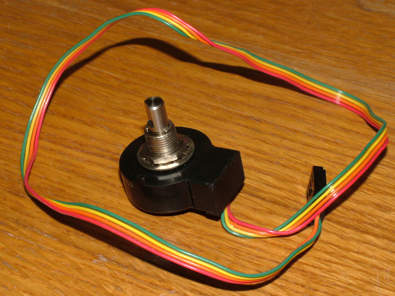 ve starých šuplíkových zásobách jsem našel tuto součástku. Je to rotační encodér, něco jako IRC. Má to dva výstupy posunuté o 90°, zatím jsem nezpočítal kolik to má pulzů na otáčku. Jak bude chvilka tak se to pokusím nějak zpočítat.