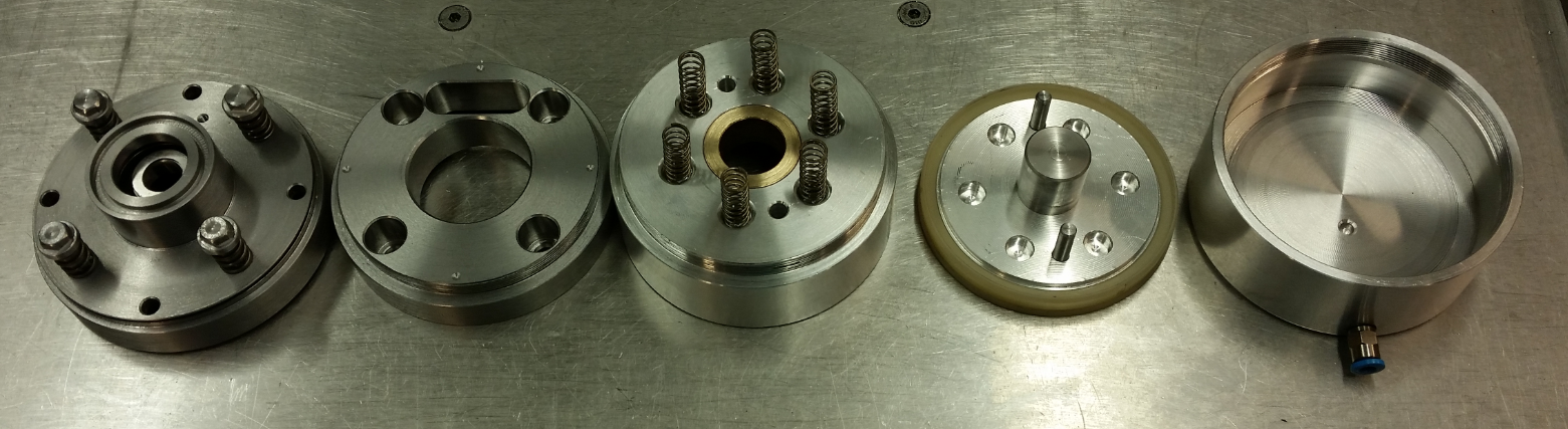Zleva je ložiskové víko s našroubovanými šroubky s vratnou pružinou, pak je ten pohyblivý díl s oválnou dírou pro HEDS, přední víko pneuválce s pouzdrem pístnice a hratnými pružinami, píst s těsněním a víko pístu.
