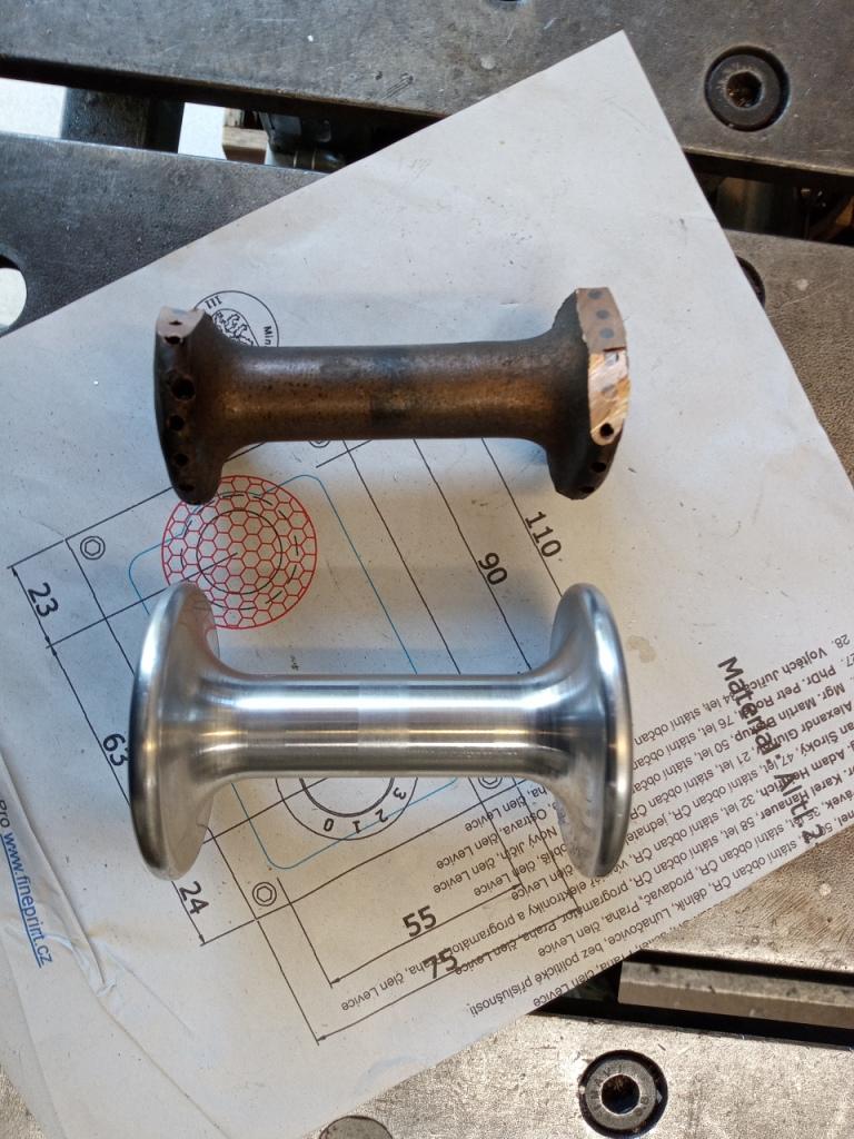 Dnes první produkt na soustruhu D240x550, upravený na cnc. Nába na historickou tříkolku. Zatím ověření funkce soustruhu, materiál 7075. Ve finále bude z mosazi (i když originál je podle barvy bronz) a náby budou dvě. I flanšny jsou o kus vyšší, protože se musel vyštípat výplet a požadavek byl použít původní dráty.