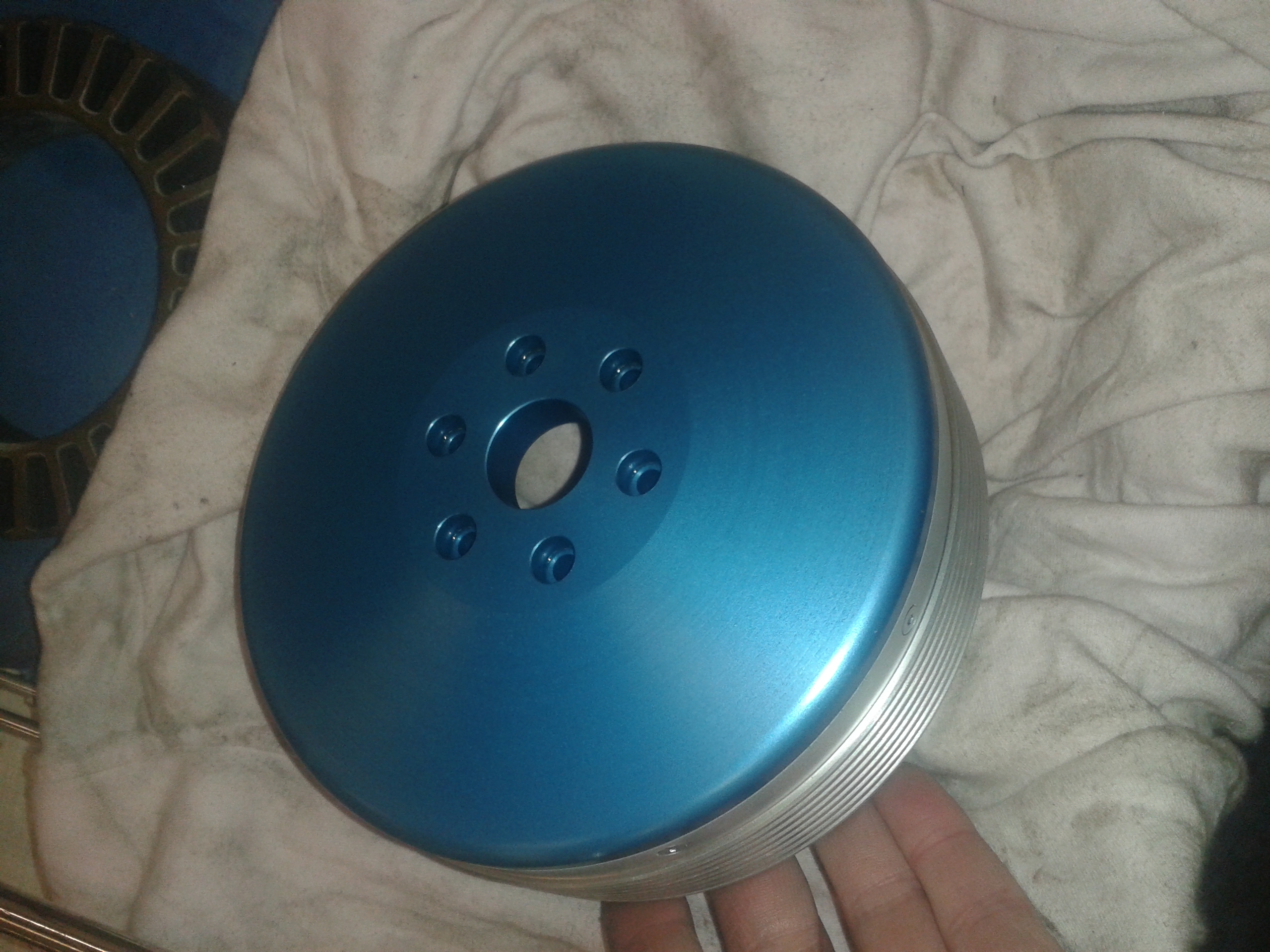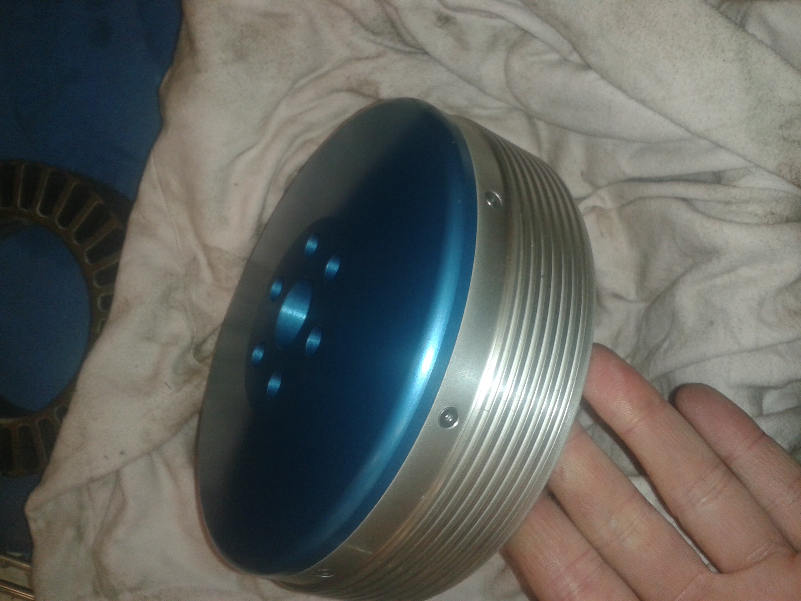 Tak dokončuju testovací vodou chlazený motor a nechal jsem rotor kadmiovat na bílo a čelo dát na tvrdý modrý elox. Vypadá to pěkně, rozhodně líp než černý zinek který je úplně k prdu.