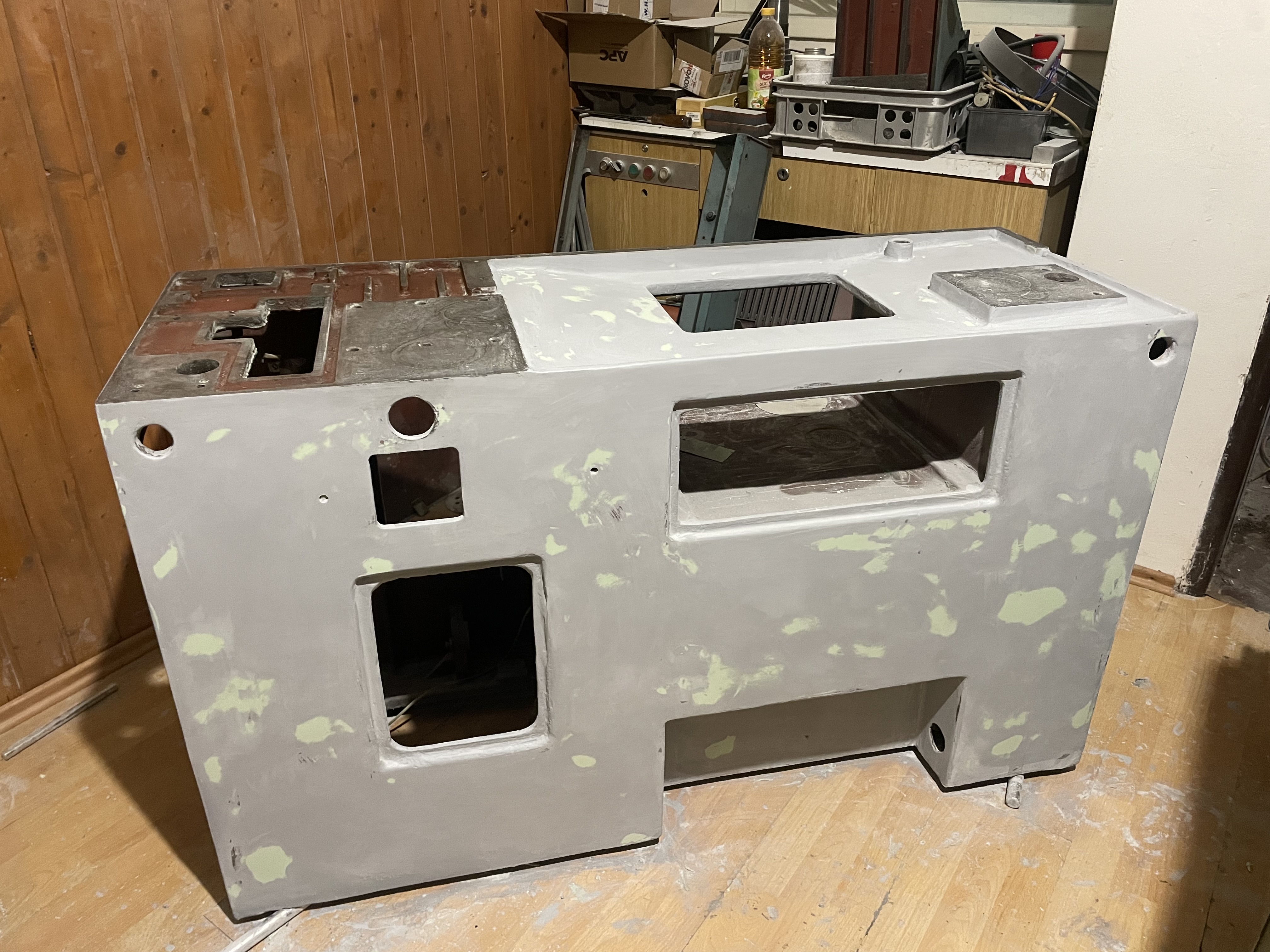 Původní lak s tmelem jsem oklepal jehlovým oklepávačem a seškrabal šábrem. Byly ho tam dobré 3mm. Důkladně vsě odmastil ředidlem C6000. Jako první šel na řadu akrylový základoplnič 4:1, následovalo rychlé přebroušení (nějak mi nedošlo, že mi na litinu tato vrstva nestačí a musím tmelit). Tmel jsem použil “mártyho zelený tmel”. Po té přišla na řadu nejhorší činnost, přebroušení tmelu. Aby mi to rychle odsýpalo použil jsem hrubost smirkového papíru 80 s excentrickou bruskou. Tvar podstavce je k tomu díky rovným plochám pěkně přívětivý a ručního broušení je minimum. Protože však litina byla křivá jako prase, probrousil jsem dost míst až na kov. Snažil jsem se o co nejmenší tloušťku tmelu. A tak jsem nanesl ještě 2 vrstvy základoplniče a přebrousil brusnou mřížkou 240.