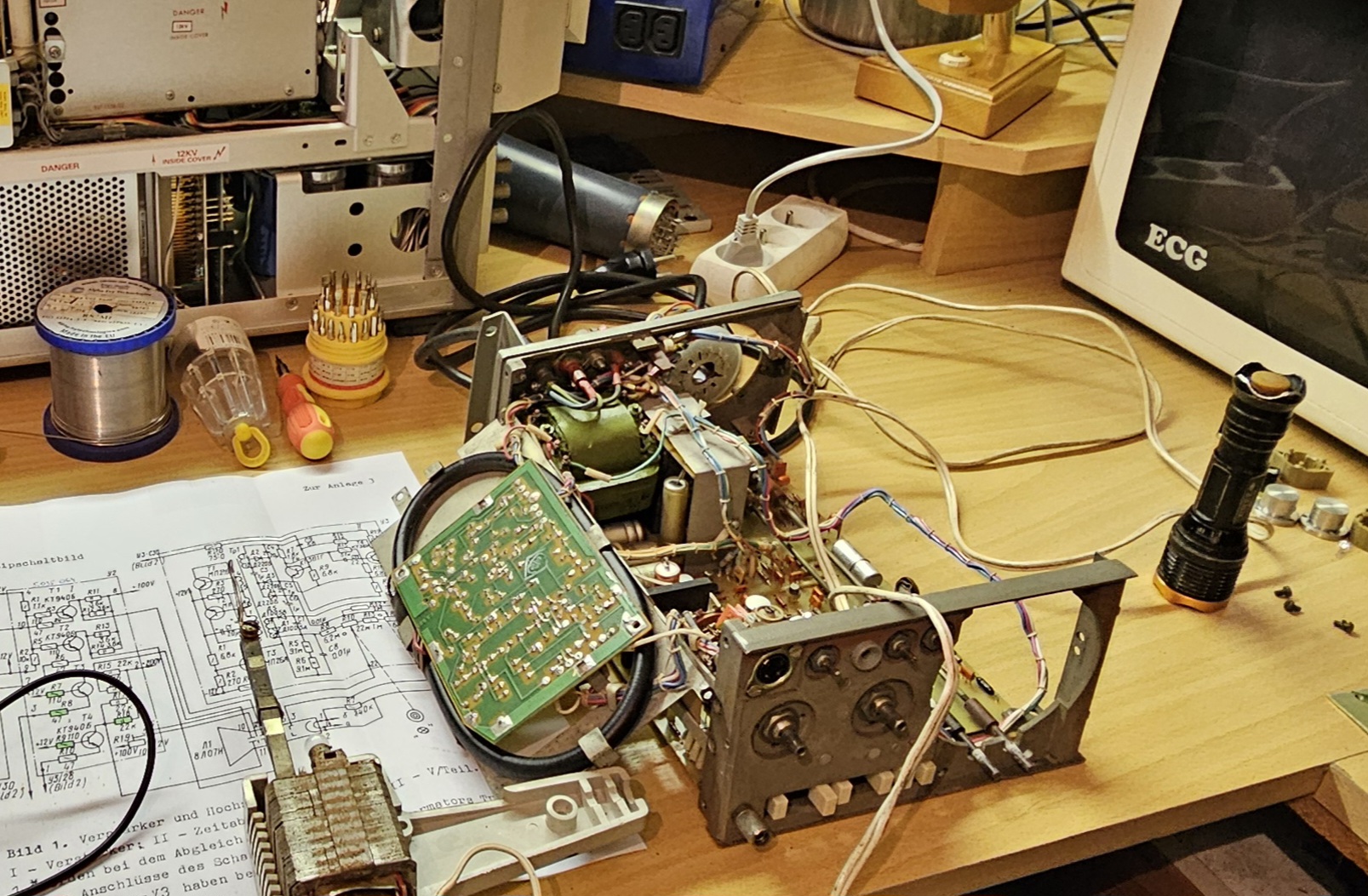 Problém byl v elitech C1 a C2, ty byly bez kapacity. A pak byl sesmažen rezistor R4 v kolektoru tranzistoru T3 MP26A, který tam vlastně není, protože tam dal někdo MP16A, a to vše v sekci Y3..