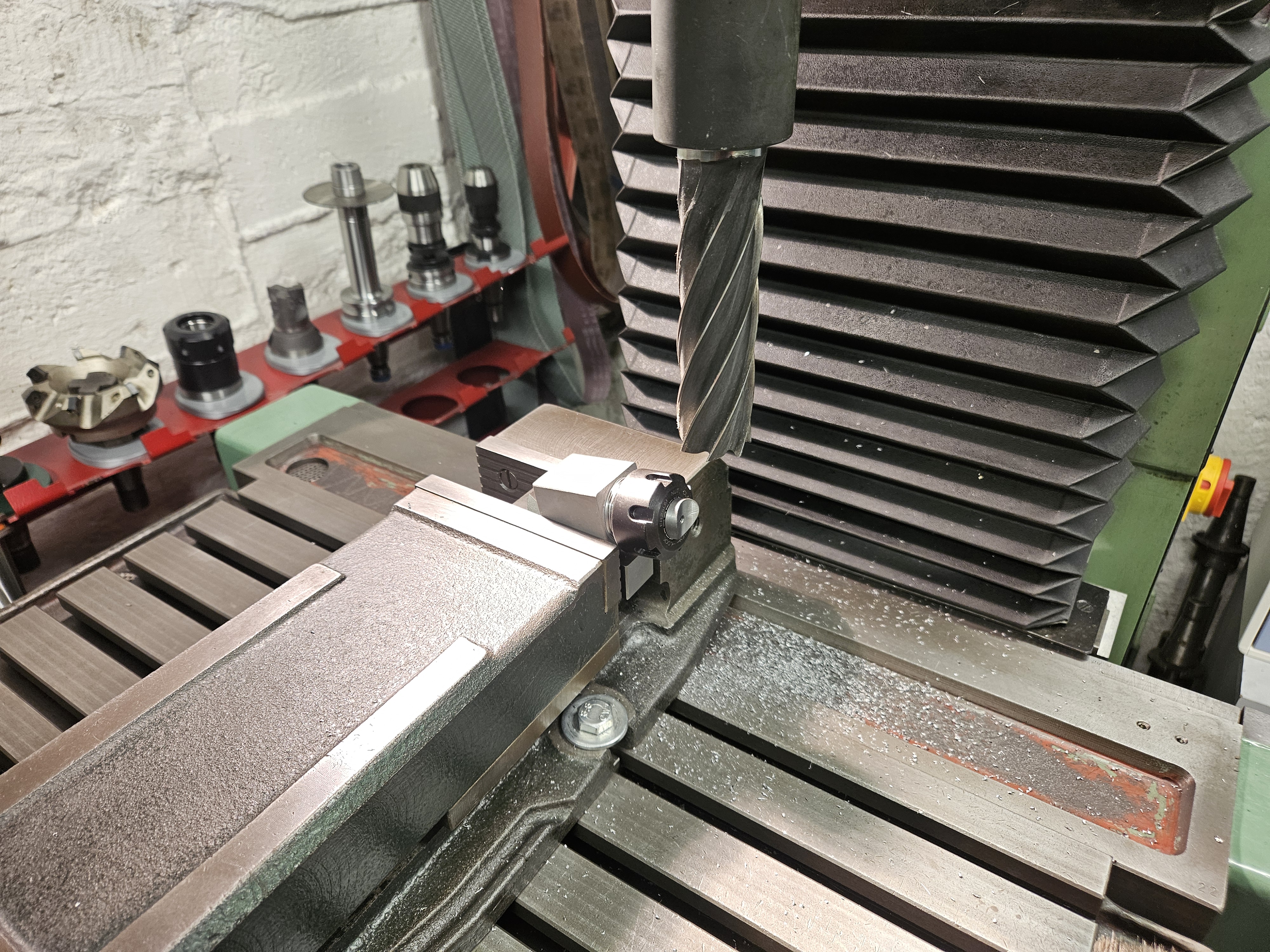 Abych nezničil dřevo, trochu porod to na stůl upnout a srovnat, pod úhlem vyvrtat, otočit, zahloubit na dva průměry. Vajglík ubrat, naštěstí jsem našel 32mm frézu mk4 a s ní to udělal.