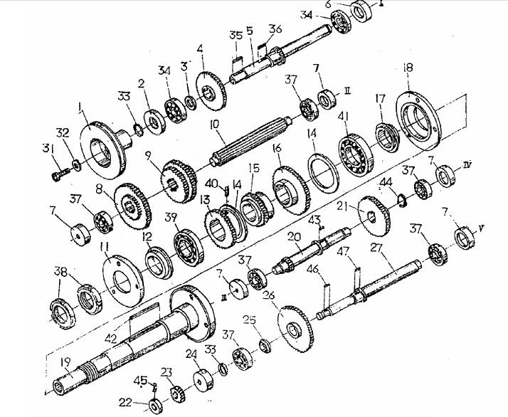 Jen tak mimochodem, dokázal bys najít nebo nakreslit řez skříní vřeteníku? Jedná se mi hlavně o axiální zajištění vnějších kroužků ložisek poz. 41 a 39, tj. která strana kterého kroužku je o co opřena/volná atd.