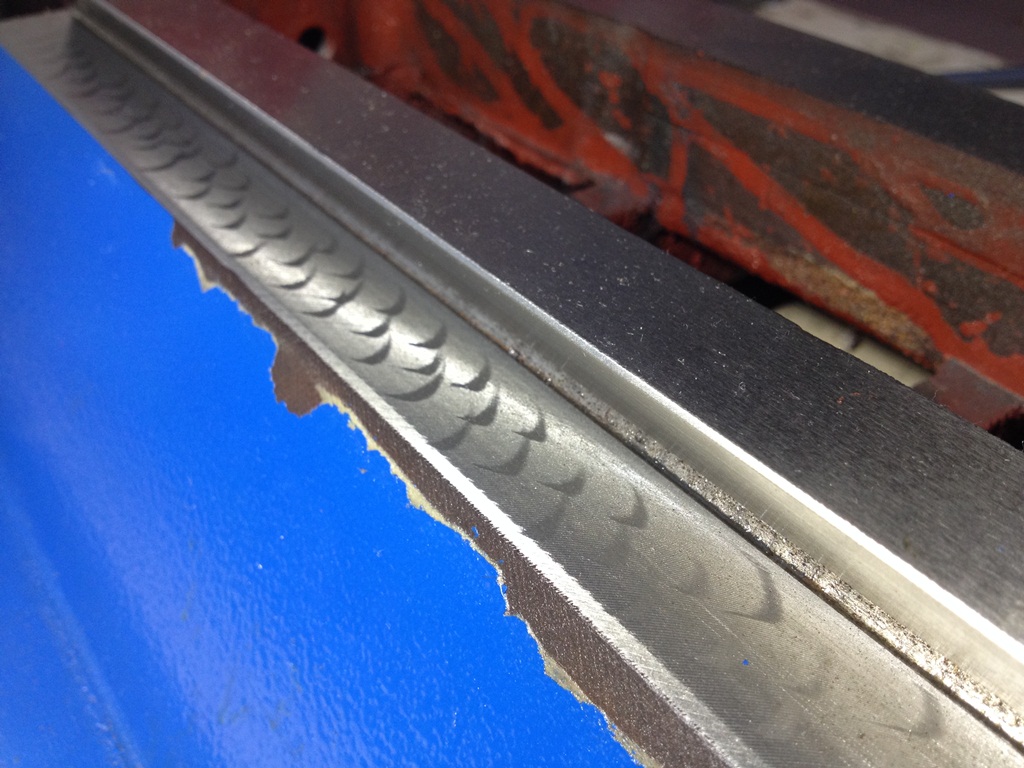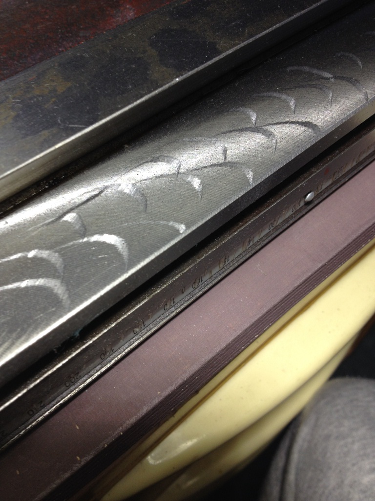 . Pokud mám škrabák s nějakým rádiusem, tak přeci po zatlačení do materiálu budu mít jen rovnou rýhu širokou podle hloubky zatlačení, ne? Tady vidím krásné měsíčky a ještě na okraji s prodlouženou hrankou.