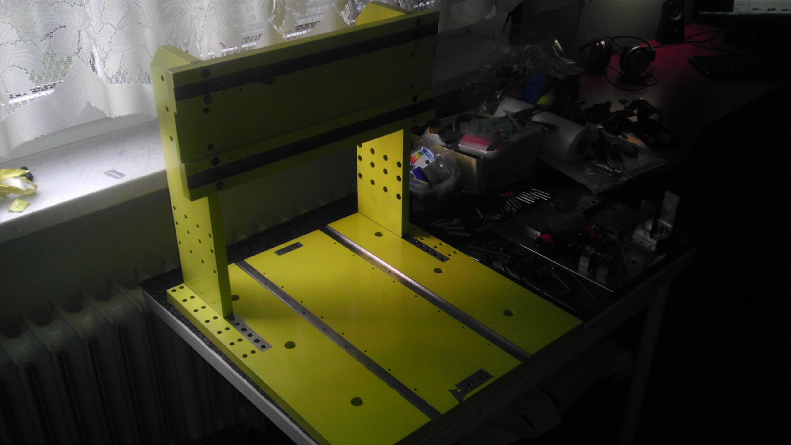 Tak jsem zase pokročil dovezl si domu Z osu ktera jeste neni na fotce :-) dal to do barvy akorát když tam není základ tak barva drží horko těžko a to stála celkem dost .. viz na jedne fotce pri odlepování kar.pásky sebou přibrala barvu...Tak pak ja kto bude komplet tak to opravím.. Stejně se barva hodněkrát poškrábe nemluvě pak za provozu co se stím stane :-D Tenhle týden doufám dorazí ložiskové domečky do kterých se bude dělat otvor pro kélíky :-) a pak začno uprvní testy :-) Dnes ještě musím skolíkovat ramena s hl.deskou a příčník s rameny :-) a dotáhnout :-) Jinak doposud sem samotne části nosil v ruikou a sám... Teď už nejsem schopen to zvednout sem zvědavej jak to přenesem do dílny až to budu mít v kupě a odladěné :-)