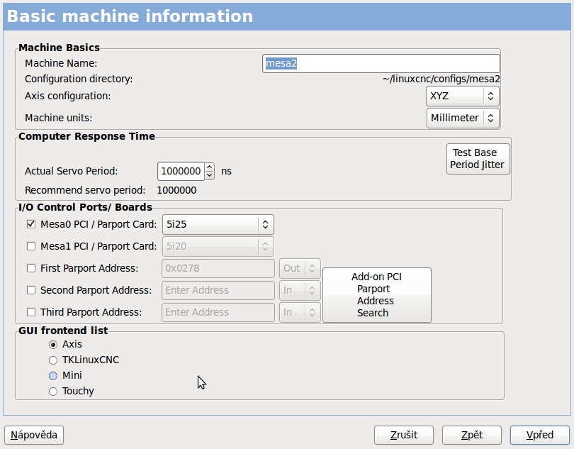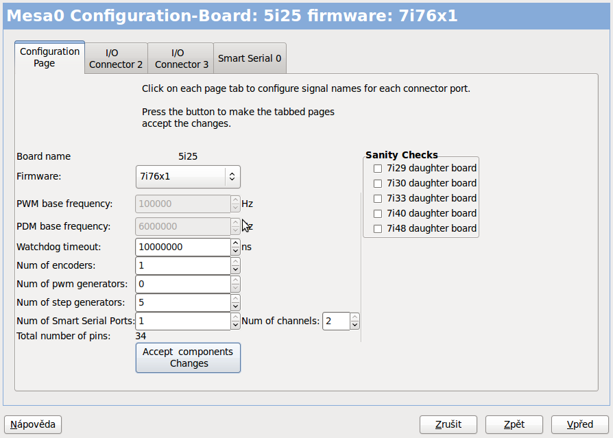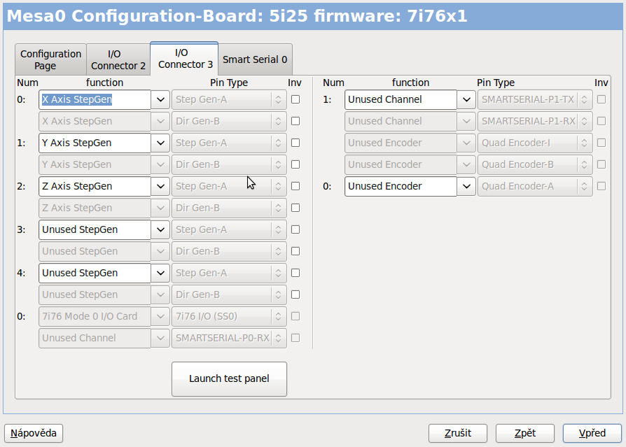 3. v pncconfu jsem vybral 5i25 a v dalším kroku 7i76x2 kartu, zhruba jsem nastavil dir výstupy pro drivery a dokončil pncconf.