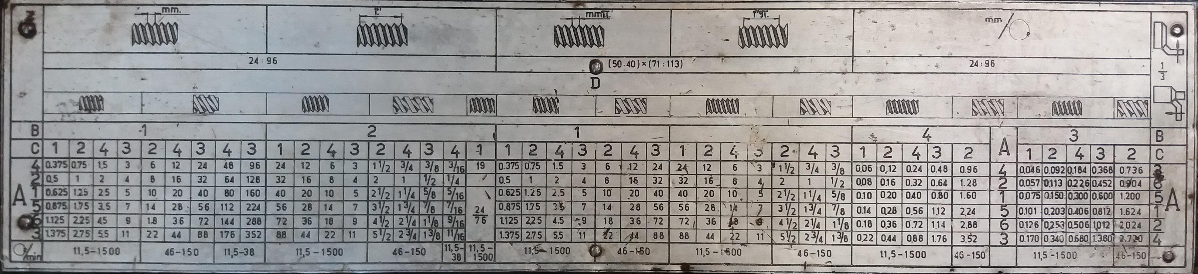 potřebuju hlavně el. schéma a posuvy při řezání závitů - jak poskládat ta vložená kola. v té tabulce je psané, že na metriku a Whitvorth má být ( 50 : 40 ) : ( 71 : 113 )