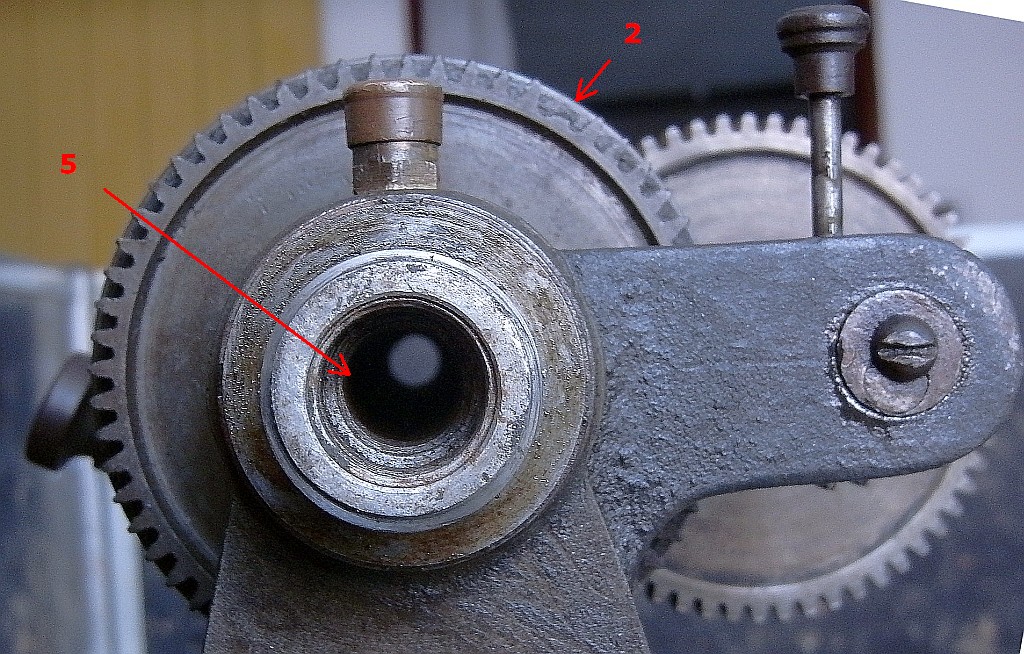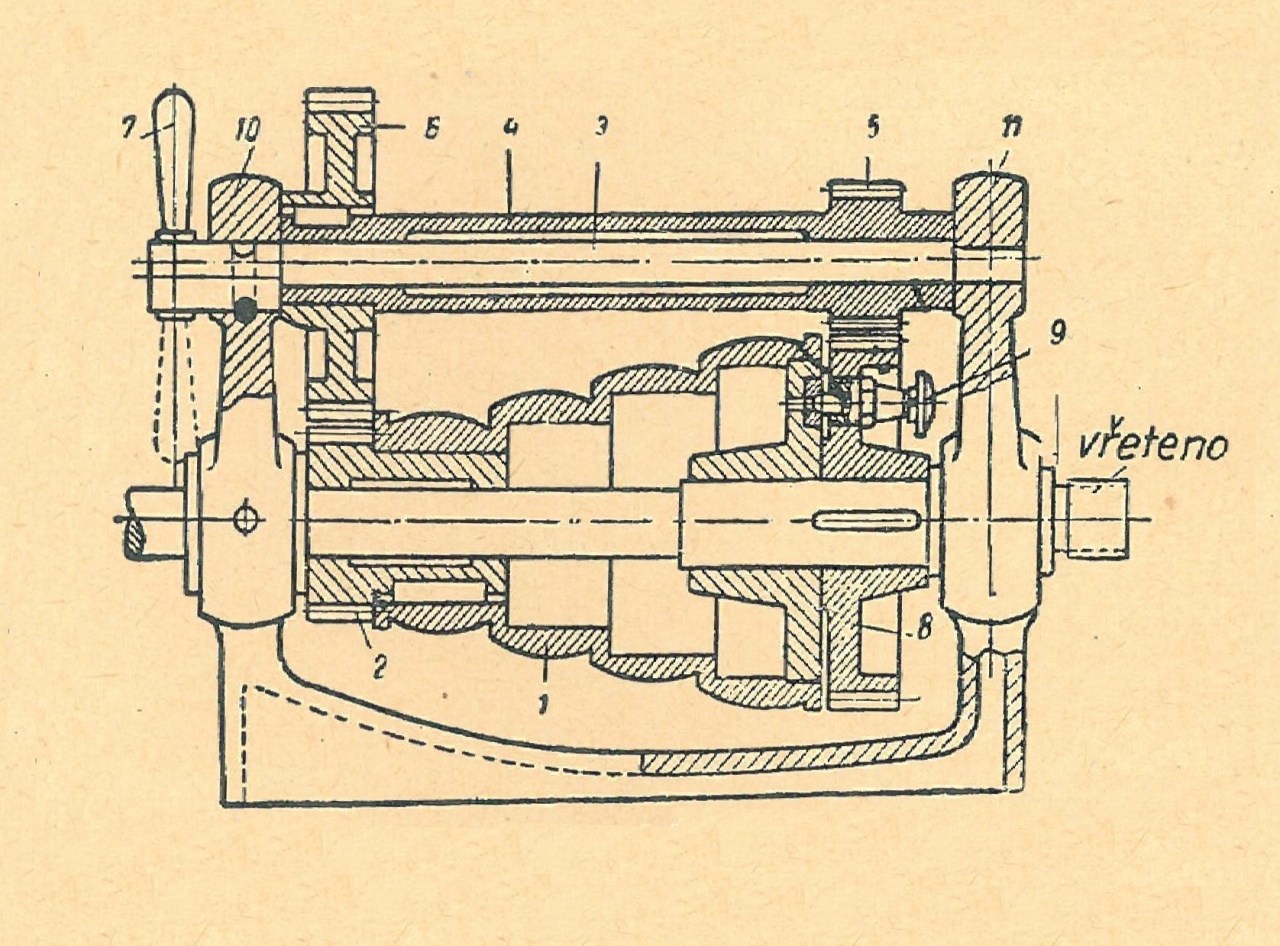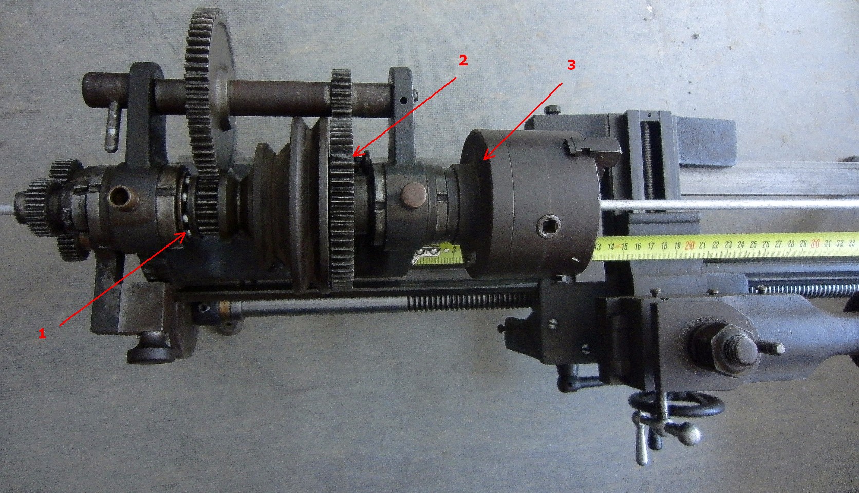 Bingo! Teď je mne fungování předlohy už jasné. Přes řemenici je poháněno malé ozubené kolo, které se společně protáčí na hřídeli vřetena, pohání pak převodem do pomala přes kola připojené předlohy velké kolo bez zubu, které je pevně spojené klínkem s hřídeli vřetena. Vřelé díky.