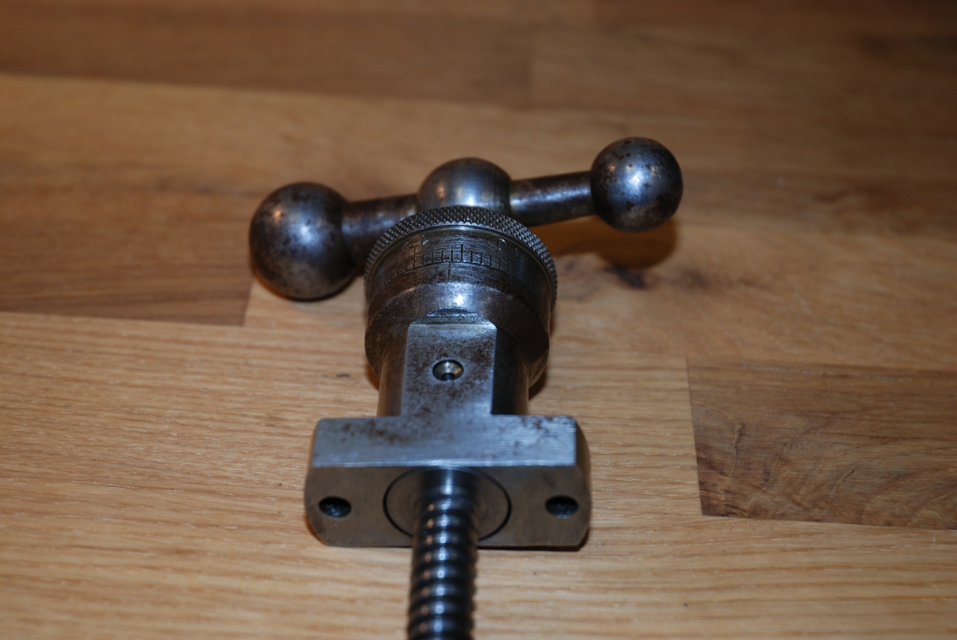 Jeden dílek na noniusu 0,05 mm. Teď jsem se zaseknul na tom že nevím jak sundat kličky z posuvových šroubů. Není mi jasný jestli jsou kličky na těch šroubech nalisovaný