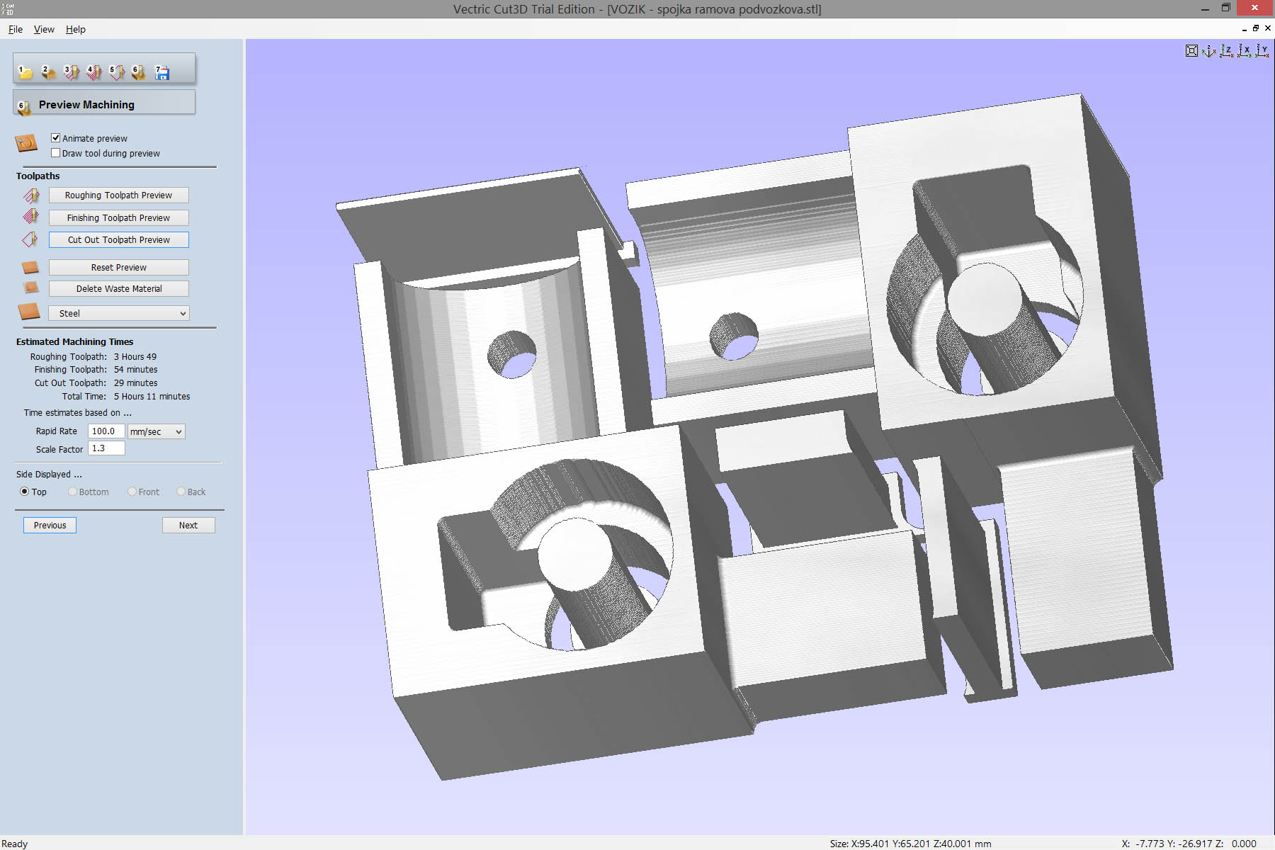 Když jsem teď dal do Cut3D model spodjí rámové spojky (2ks), tak mi to vyšlo hezky jak chci. Hrubování 3mm frézou po 3mm s 0.36mm by znamenalo ve výsledku včetně finišování a odřezání cca 5h práce. Pokud je to reálné, nemám s tím problém. Fréza bude mít chlazení a odfuk, takže teoreticky jen vyměním frézu.