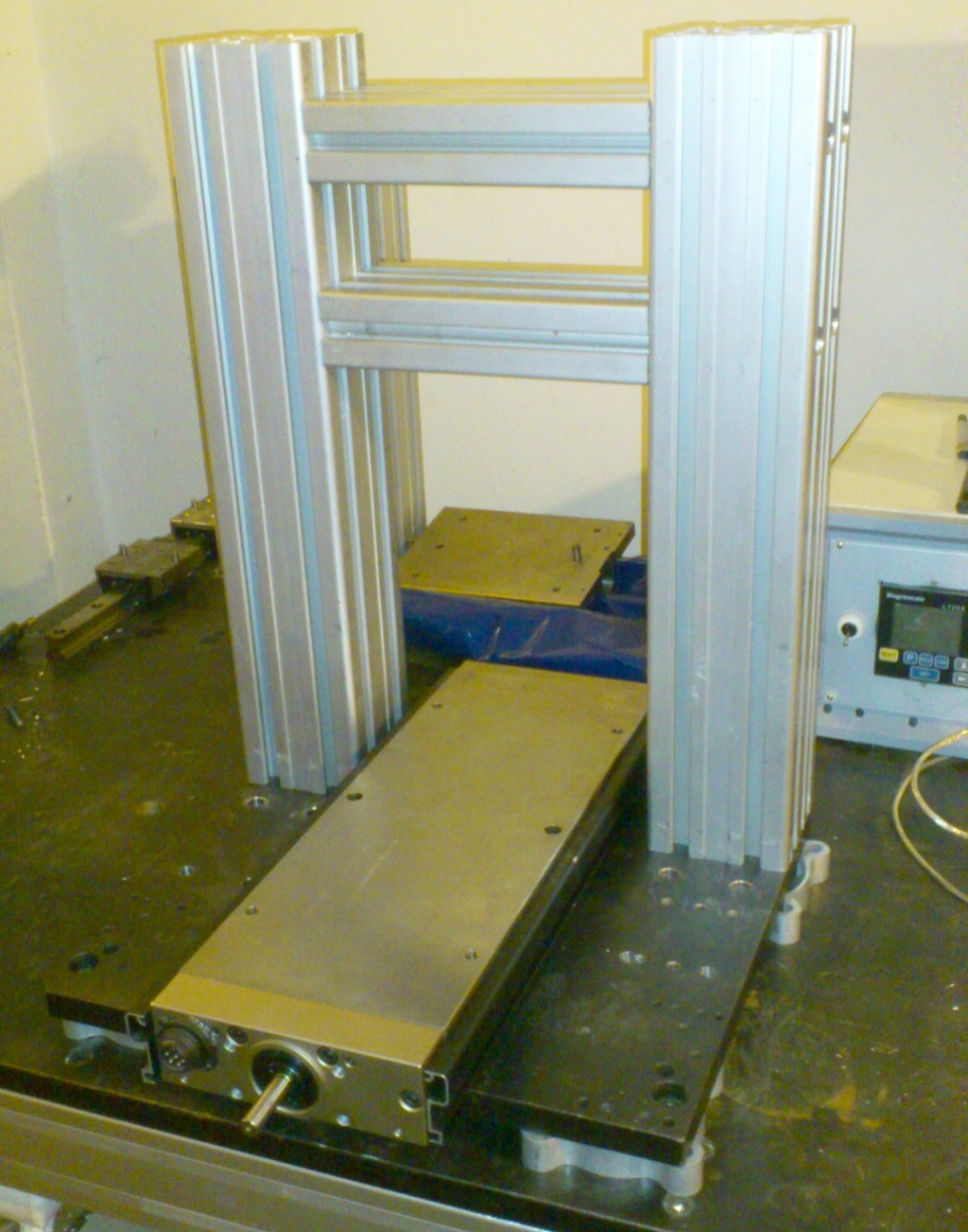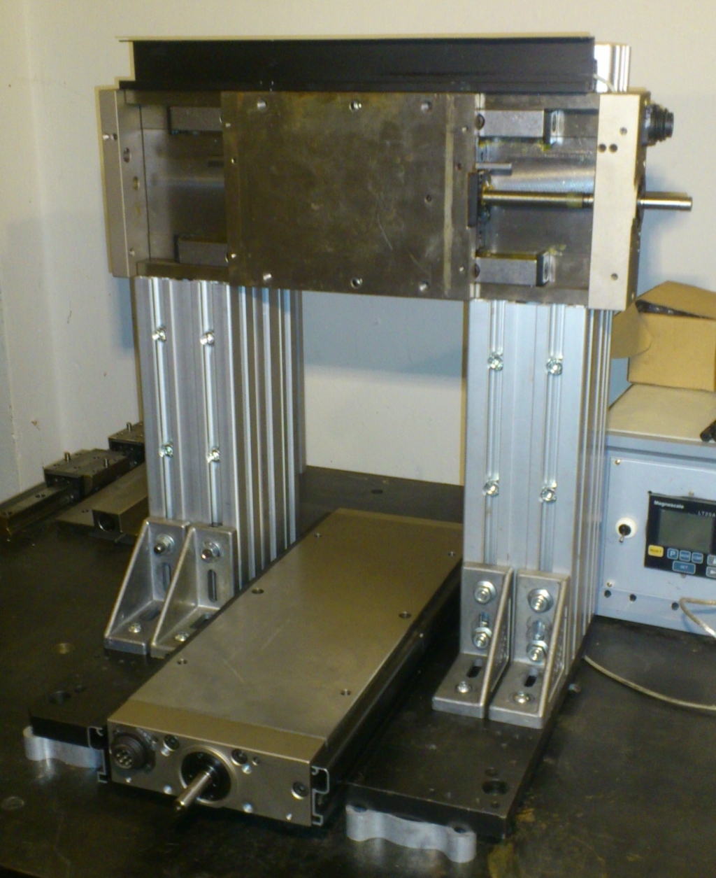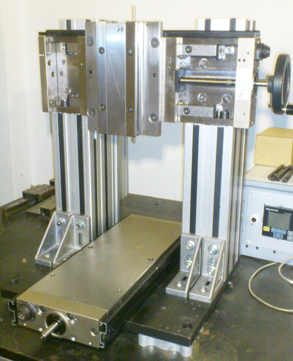 Portálek, rozjezdy XYZ 170mm na ocelových vedeních, Pohony XY serva, Z 3f krokový motor.