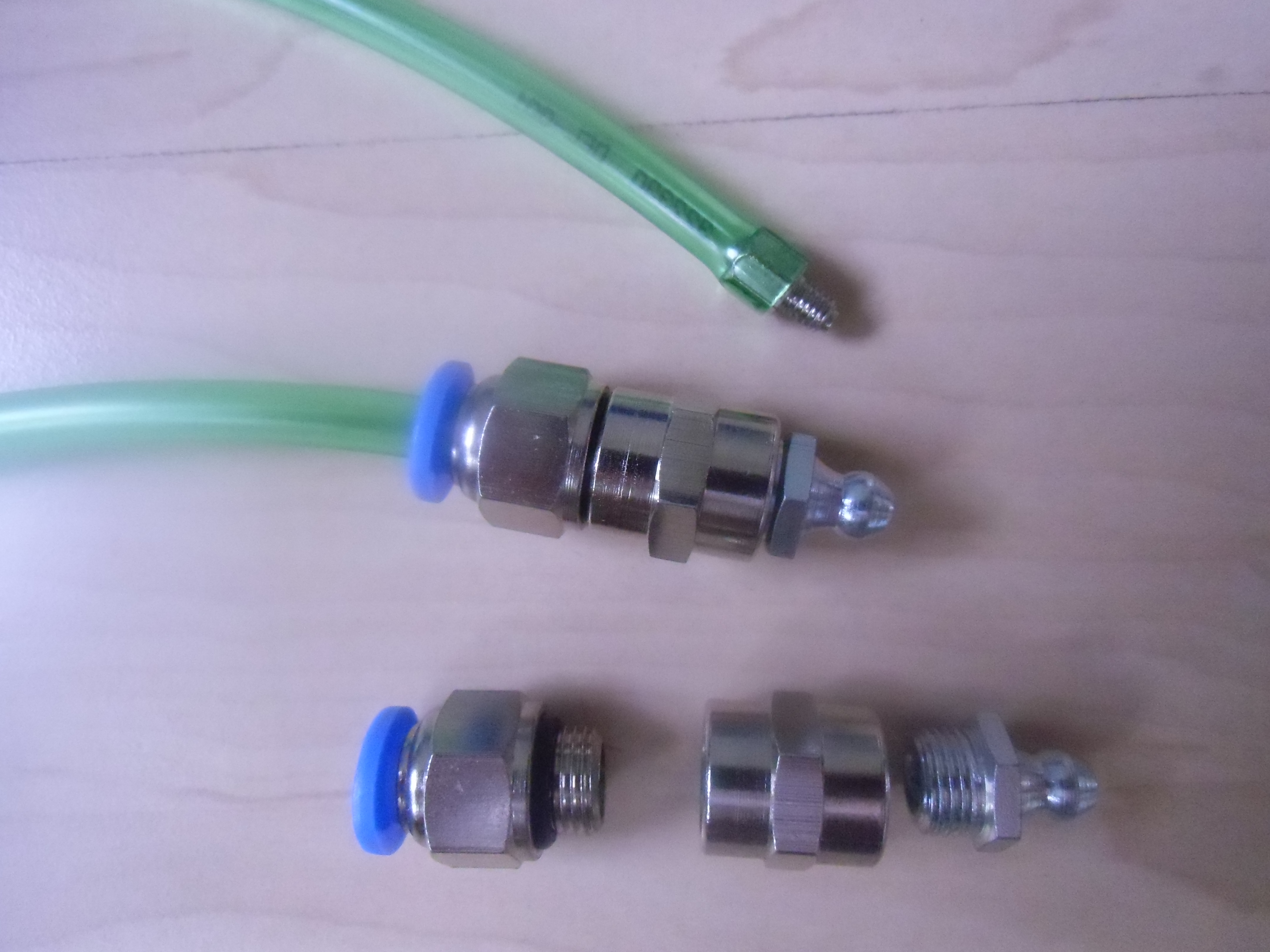 hadice mam na vzduch 4mm, ty koncovky na vzduch začinaji na M3 a 3mm hadička. měl jsem to vruce. lis nějaky obyč za 250kč z ferony. valím tam normalně vazelinu a no problem.
