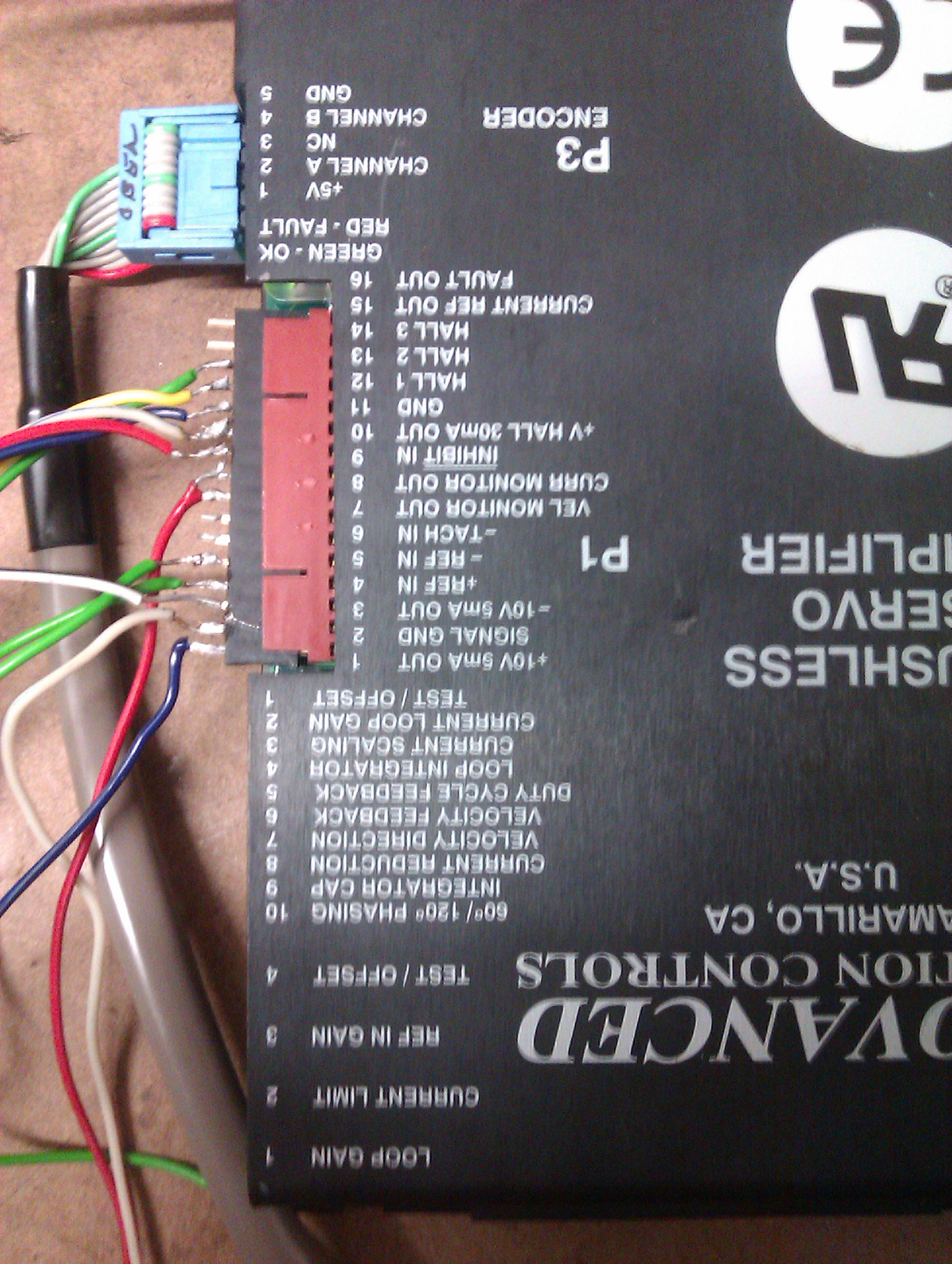 Motor má 120° fázování, A, B, C Hallovy sondy komutace, výstupy jdou do zesilovače.