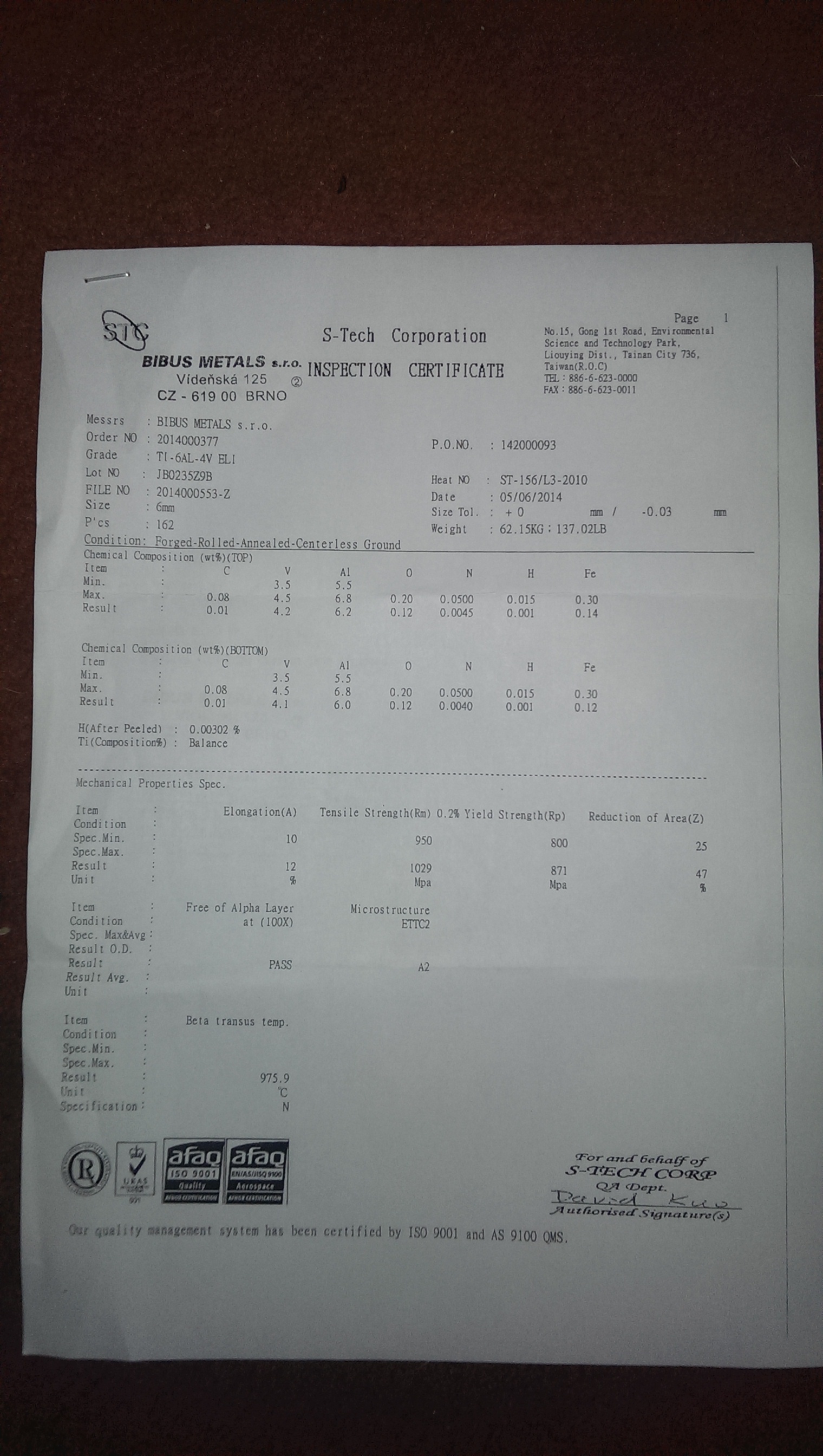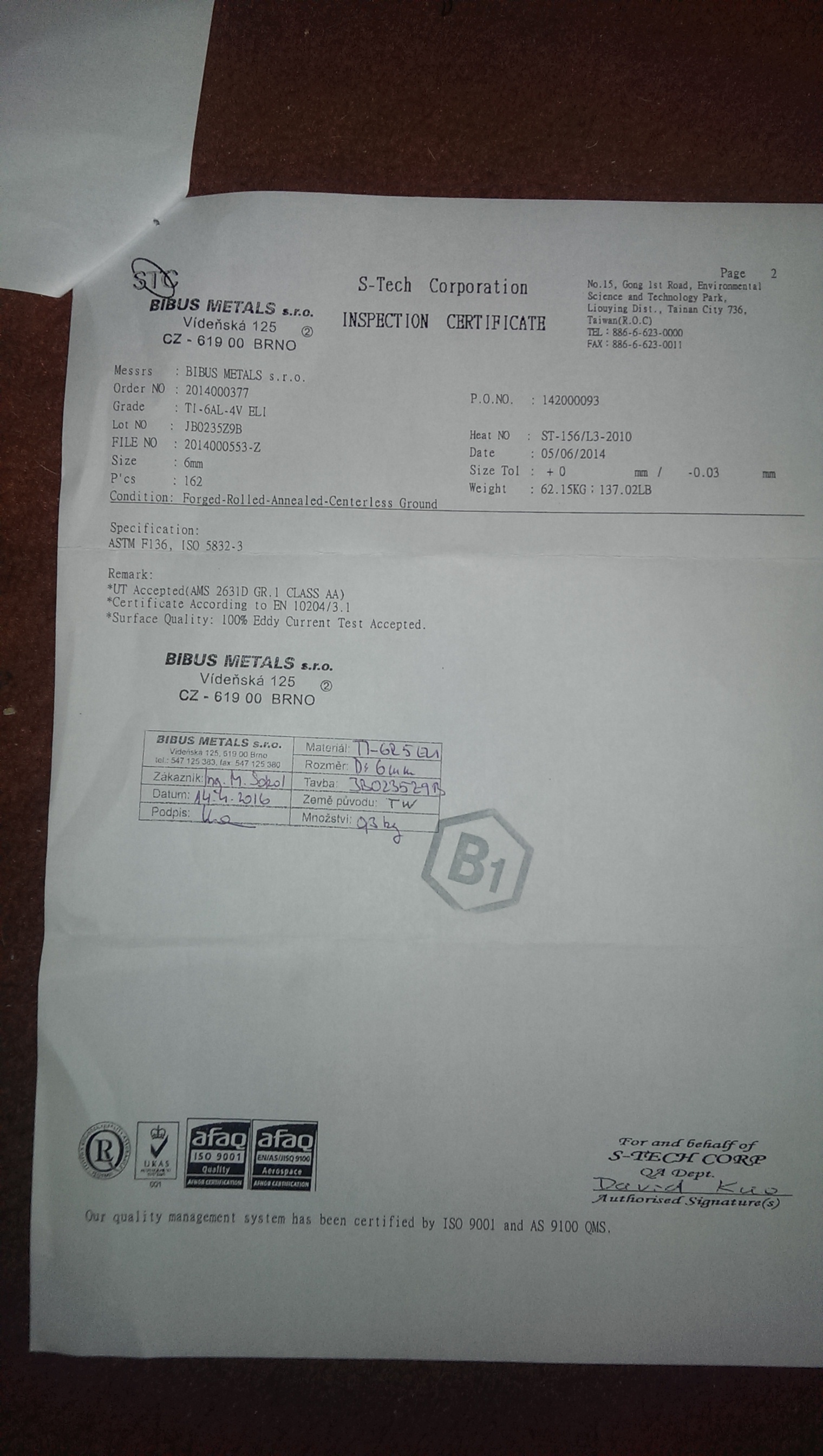 My jsme samozřejmě materiál ověřovali - přikládám fotku pro zajímavost (grade 1). Souhlasím s Vámi, že papír snese všechno a pro letecké aplikace a podobně je jedinou možností kontrolovat úplně každý kus materiálu, i přes to že výrobce/distributor garantuje že kusy pocházejí ze stejné tavby. Přestože uvedená fotka žádný důkaz samozřejmě není, doufám že rozptýlí alespoň pochyby o 30% :)