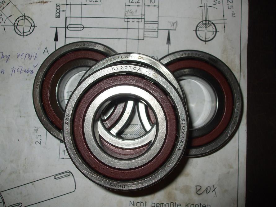 Nadávno som zohnal tieto ložiská v presnosti P4 do mojej BN 102. Nie sú predpäté, tak som ich podoprel na vonkajšom krúžku, a vnútorný som axiálne v smere osy zaťažil 10-timi kg, aby som zistil na akú hrúbku zbrúsiť distančné krúžky. Rozdiel výšky pri predpätí mi vychádzal pri jednotlivých ložiskách od 5 do 8 tisícin, no na jednom je 27tisícin (nemal som ho opačne otočené