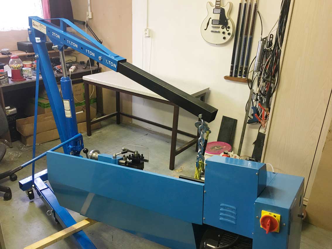 . To ne, vytáhnul jsem tedy z garáže žirafku a nakonec po půl hodině soustruh zaparkoval na stole. Zatím provizorně, musím dotáhnout elektriku, přidělat měnič, zapoměl jsem přesvorkovat motor na 230V, utřít všude ty vrstvy vazelíny a pak dodělat všechny nedodělky, co tam jsou. A že jich je. No a až to bude, soustruh přitáhnu ke stolu, hodím do váhy, uklidím žirafu a hurá do práce.