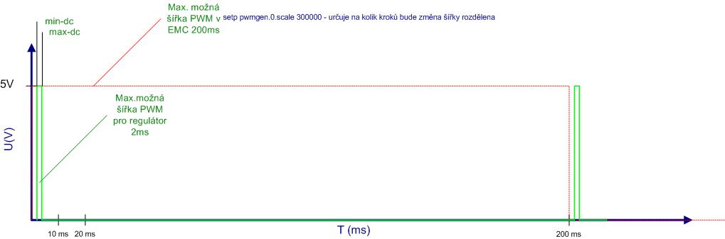 Volne nastavitelny kmitocet je v tomto nasem pripade nastaven na 50Hz, coz je kmitocet pouzivany beznou modelarskou elektronikou(special serva maji jine opakovaci kmitocty), sirka impulsu pro rizeni pohybu serv(nebo rozsah regulatoru) je 1-2ms. Protoze vsak EMC ridi impuls v celem rozsahu od sirky 0ms(0V) do 200ms coz je max. time pro navolenych 50Hz (plnych 5V) muselo se zde nastavit entitou min-dc a max-dc omezeni pulsu do dolni oblasti celeho rozsahu ktery je v plnem rozsahu 0 - 1. Z toho vyplynulo 0.036 - 0.1. Hodnota scale pak rozdeluje celkovy rozsah pwm-ka na pocet skoku. Abychom dosahli dostatecne jemnosti nastavil jsem hodnotu na 300000, protoze vyuzita je pouze desetina to je 30000. Nevedel jsem kolik ti to toci na maximum. Jeto dane velikosti napajeciho napeti. Cim vic voltu tim vic max. otacek. Jestli ti to toci 36000, zkusil bych nastavit scale na 460000 hodnota 0.1 coz jsou 2ms pak bude pozadovanych 46000. Teoreticke minimum by melo zacinat na 0.05 coz je 1ms a to by melo byt 0 otacek, protoze ale tyto vysokoobratkove stridaky maji vysoke roztaceci minimum je cely rozsah zkresleny a mirne nelinearni. Regulatory se zapnutou auto-regulaci otacek maji jeste dalsi zkresleni zpusobene samotnym alegoritmem regulace, takze nakonec se musi trochu laborovat. Indikacni ukazatel na panelu by pak mel byt nastaveny na stejny rozsah jako je real, zbytek uz je na stesti a na Murphym :)
