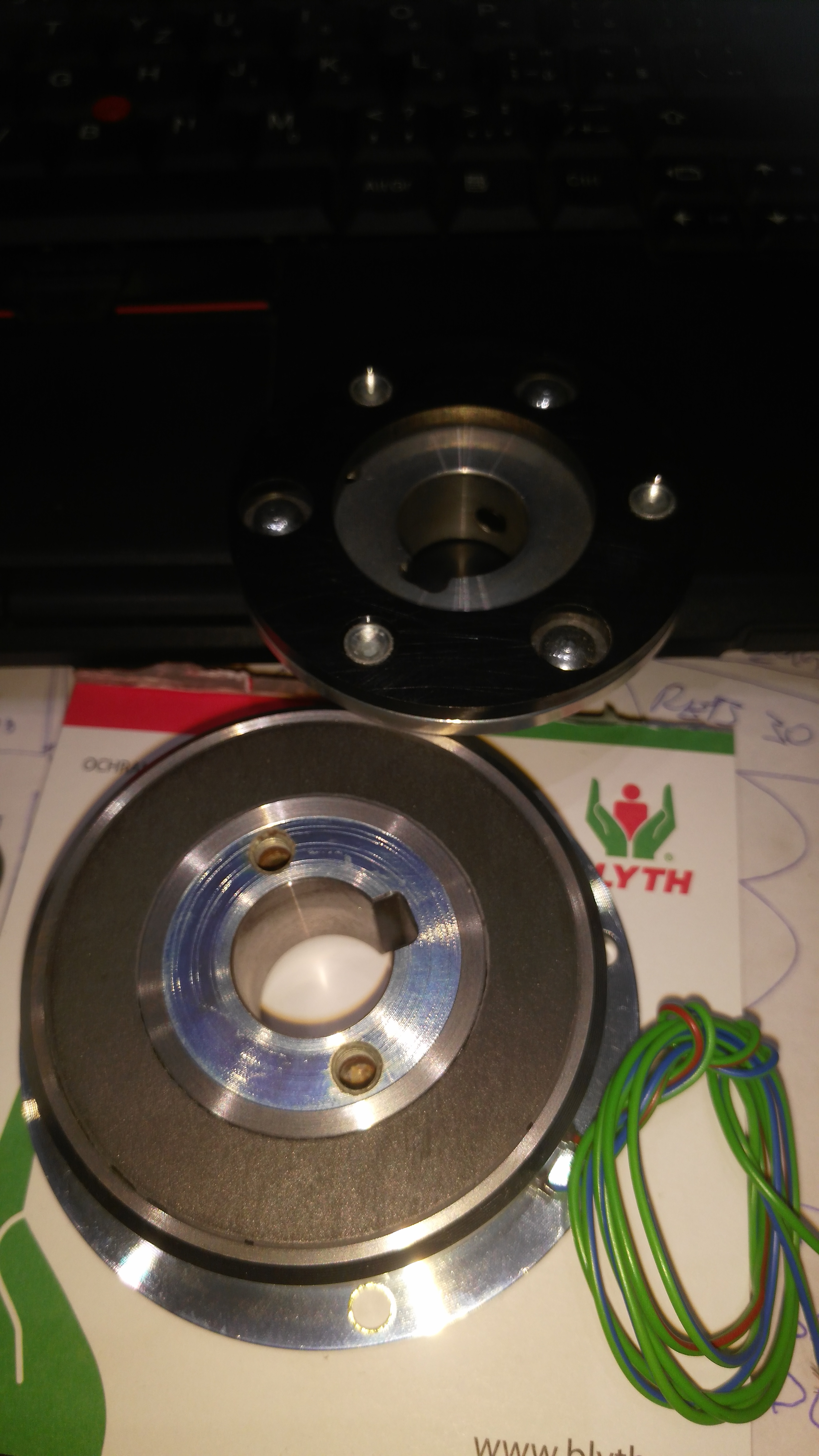 No enkonder vypada ze je uplne na konci pod vickem vede k nemu asi 6 ruzne barevnych dratu ta brzda bude az pod nim tu by jsme videli az ten motor rozpulime a kni povedou ty tri draty cernej modrej a cervenej ten konektor je z boku u privodu do motoru a ty tri draty od brzdy vedou do prostred motoru s ostatnima zluty modry zeleny