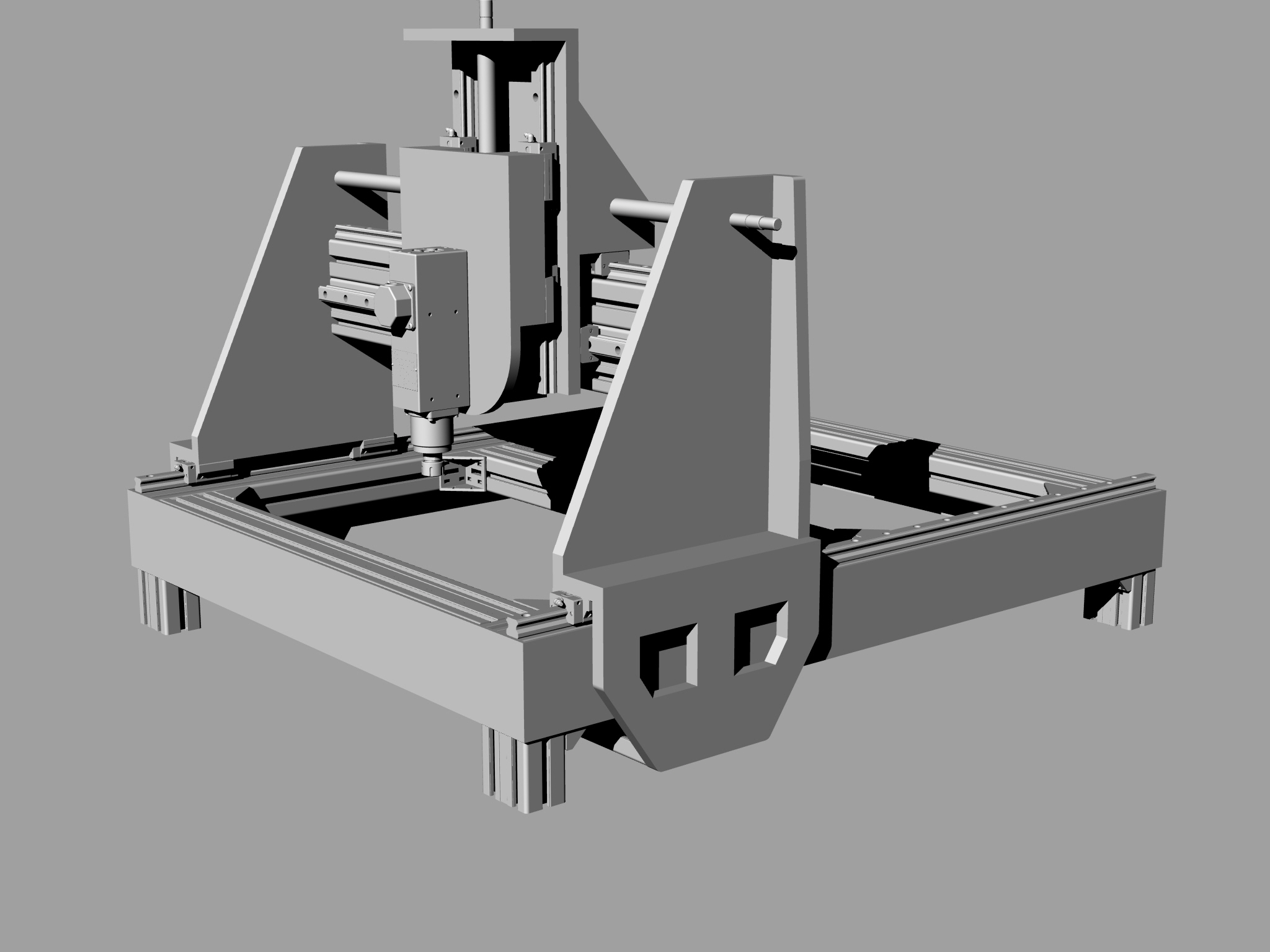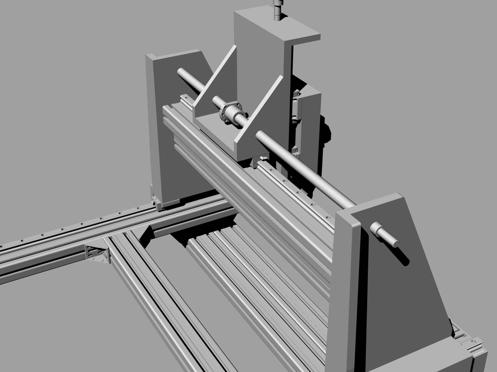 Pokud z nuly, a chceš-li se dál držet ALprofilové konstrukce, tak bych na podélný základ použil těžký profil 90x90 (pro nejdelší osu) do vnitřní díry se dá vložit ocelová hlazenka, do které se navrtají závity pro kolejnici (velikost např. 15). Společně to pak bude tvořit bytelný monolit. Z boku bych přidělal kolejnice a vozíčky, AL boky se žebry, ve spodu spojené Al deskou (1 středový šroub),vrchní část portálu například z tvých profilů, ale tvořili by tvar C (profily k sobě seštoubované), z čela by byly kolejnice, ve vzniklé drážce by běhal šroub. Z osa obdobná tvému prvnímu návrhu s bočnicemi, trošku vyššími, než jsi nakreslil.