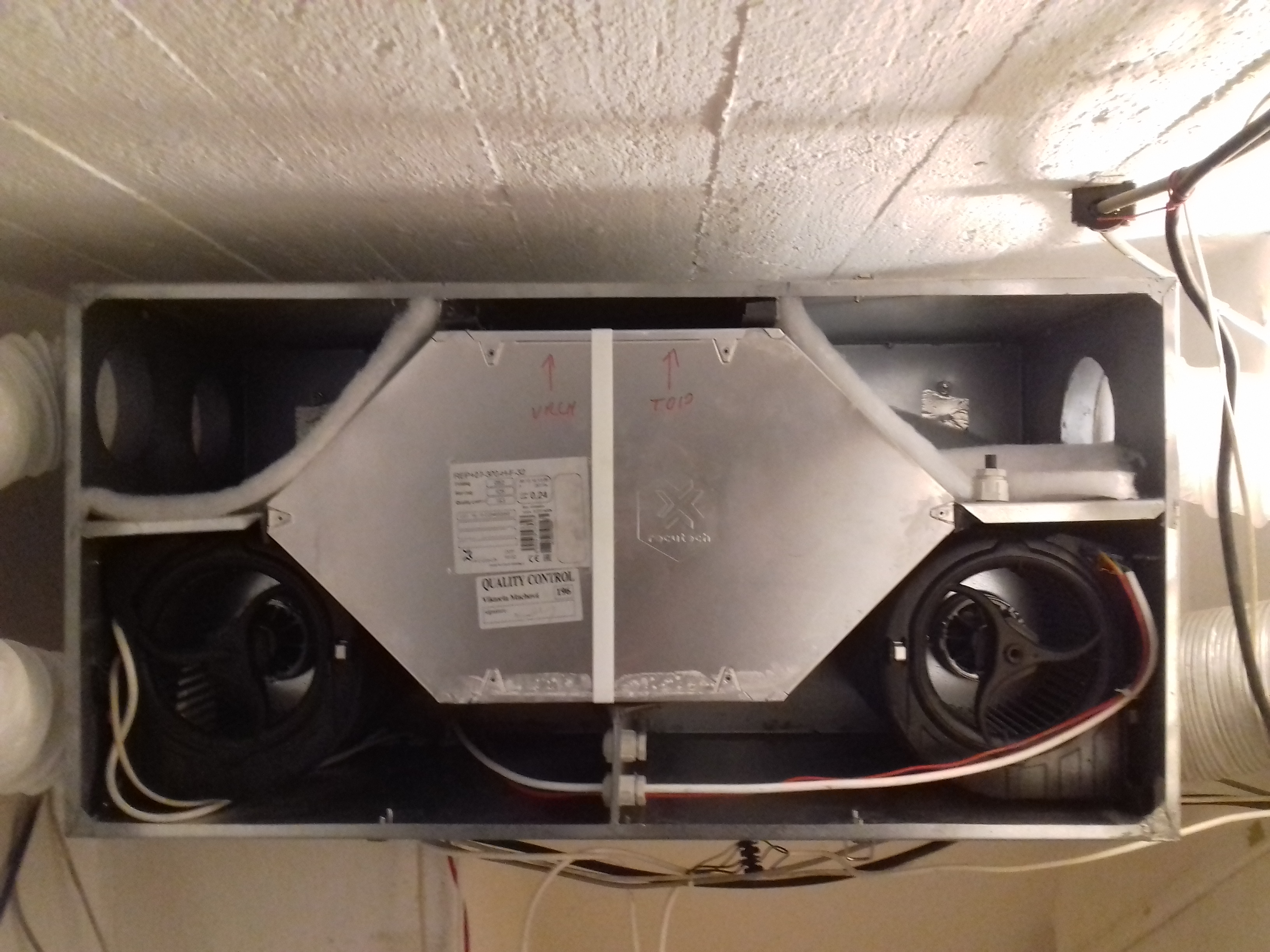 Nemám na tom žádnou tepelnou izolaci a jen někdy se to malinko rosí, nebo omrzne na začátku obnažené Al roury včetně ventilátoru. Nechápu to, ale uvnitř výměníku je sucho. Jakou tepelně výměnnou účinnosti to má nevím, ale jak říkám kamarádům. "i kdyby to žádnou nemělo, tak nemám plíseň kolem oken, mám čistý vzduch, v létě mi tam nelítají komáři a za zavřeným oknem je ticho" Provedl jsem jen velmi amatérské a jistě nepřesné měření. Venku bylo -14C, výstupní mřížka na rouře v místnosti kterou odchází teplý špinavý vzduch měla +19C tedy přibližně stejně jako teplota v místnosti. Vstupní mřížka kterou přichází čistý vzduch zvenčí - tedy přibližně teplota vzduchu vstupujícího do místnosti měla teplotu kolem 0C. Pokud mám výkon ventilátorů nastavený tak, aby proudění vzduchu nebylo moc slyšet udrží se CO2 na 1000ppm.