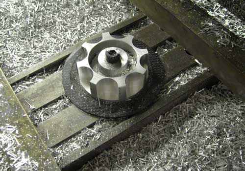 mam to hotový - za pár sekund F25 fréza průměr 19 dole to má rovný dno přesně v -19 - přesně tak sem si to představoval!! Pila řeže třetí puk!!