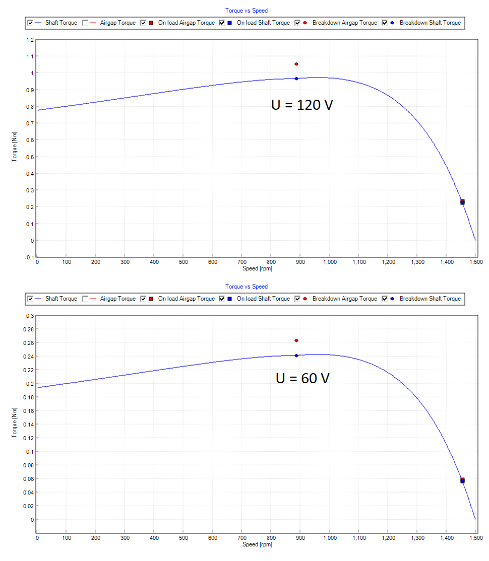 Pre zaujímavosť som si spravil jednoduchú simuláciu, horný graf je moment pri napájacom napätí 120V, spodný pri polovičnom, 60V. Môj zjednodušený prepočet celkom sedí, moment sa zníži asi na 1/4 pôvodného v celom rozsahu otáčok. Môj názor je stále taký, že niečo v tom sústruhu má strašne veľký odpor, napríklad ložiská vretena, nortonka a pod.